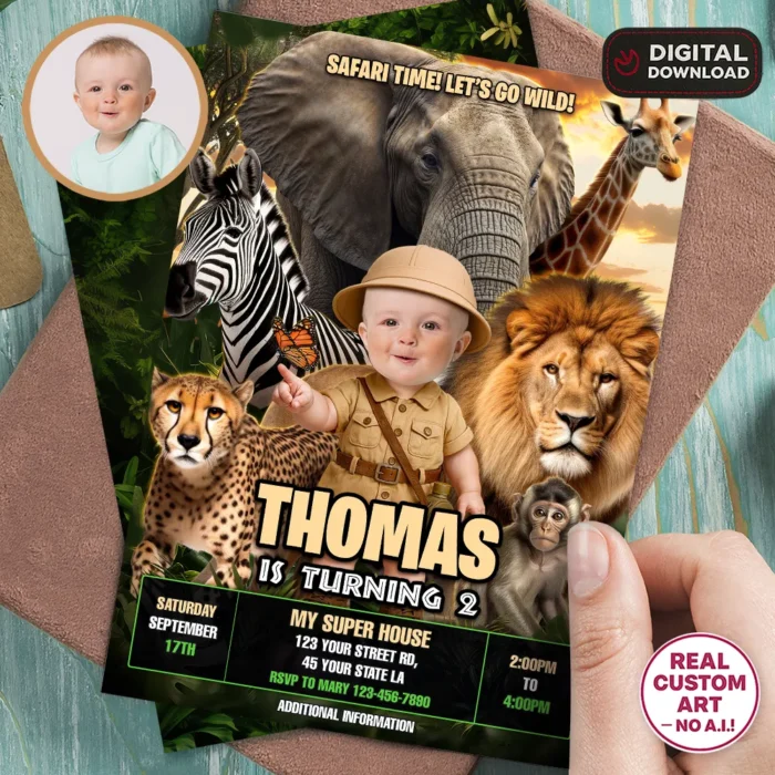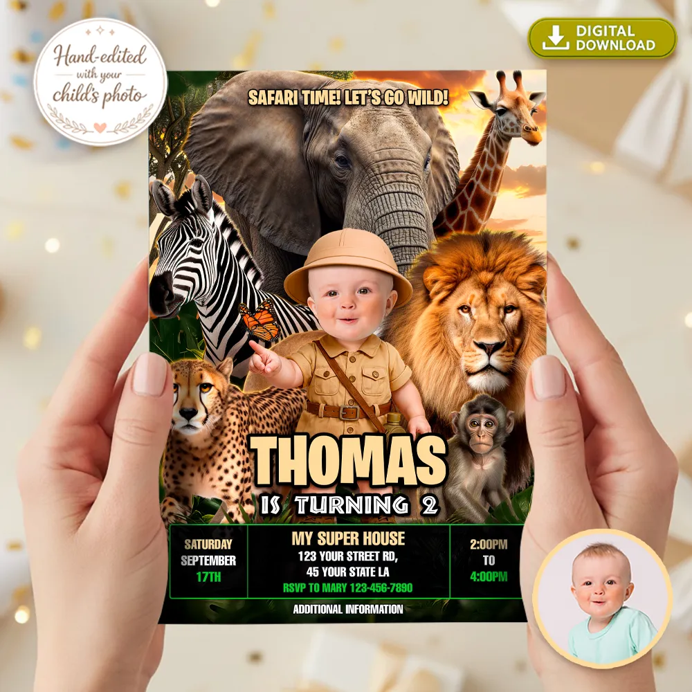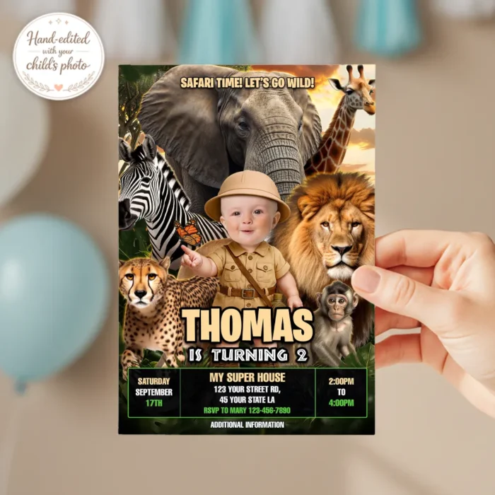 This fun and adventurous design transforms your child into a little explorer surrounded by adorable wild animals, creating a unique personalized invitation that will delight your guests even before the celebration begins.