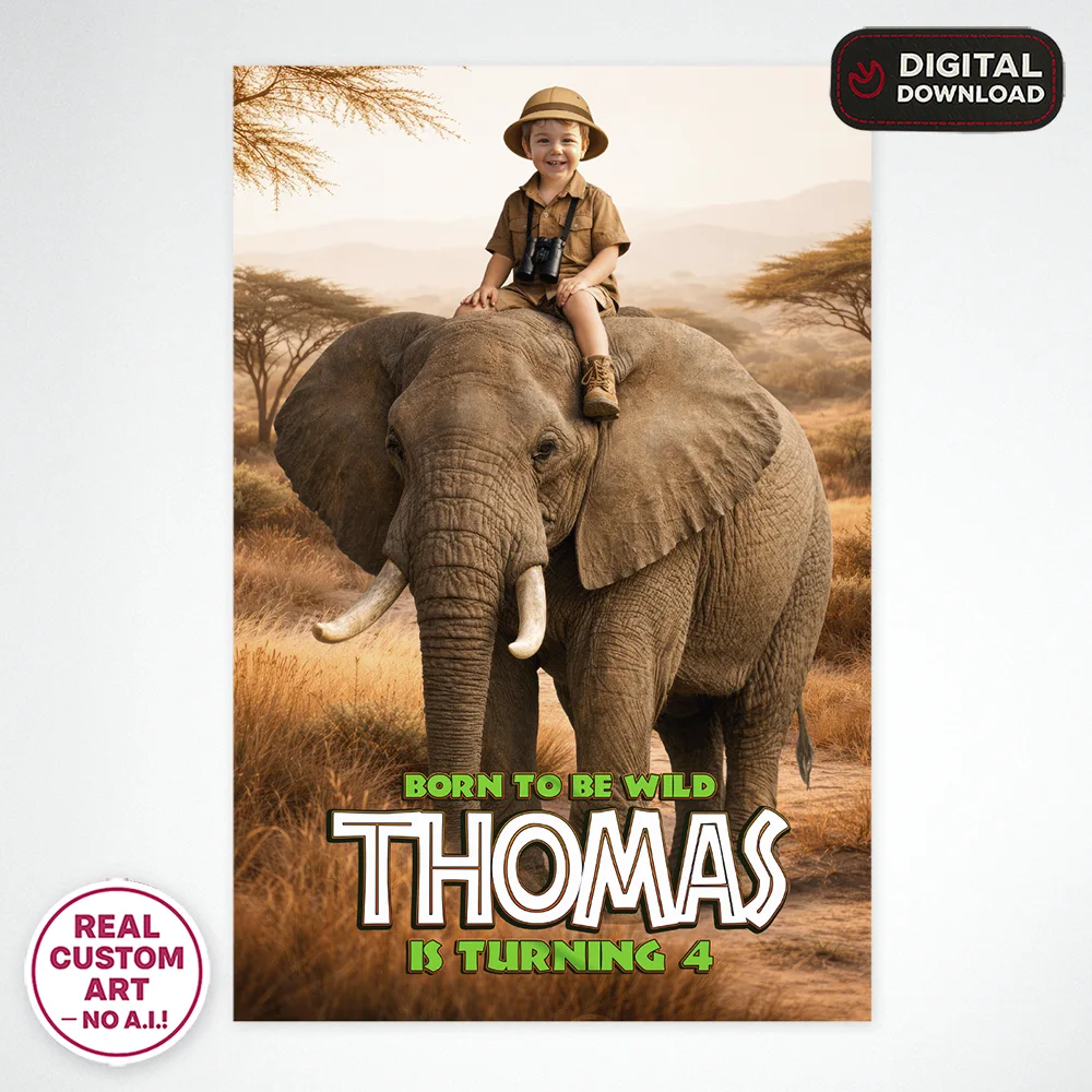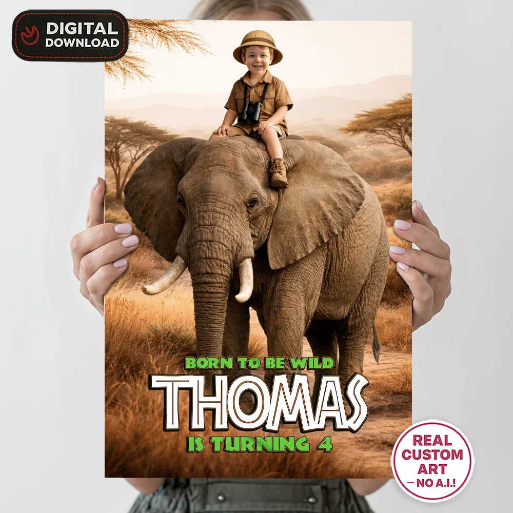 Custom Safari Welcome Sign with elephant design, personalized with your child’s photo. Hand-edited in Photoshop (no AI). Digital file delivered in 24 hours.