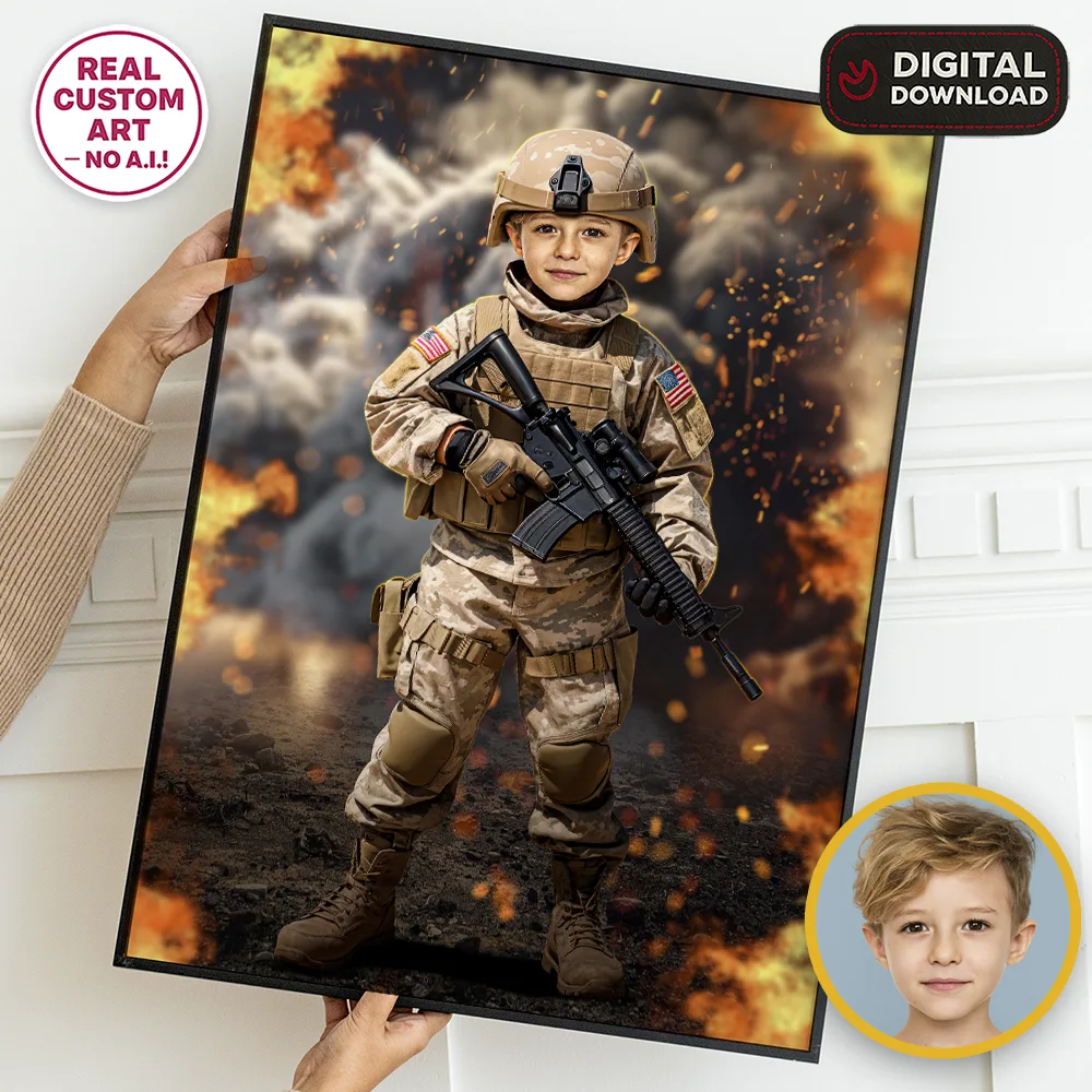 Surprise your little one with a Custom Soldier Portrait for Kids – handcrafted artwork where your child becomes the star of their own military mission. Ready to print in 24h.