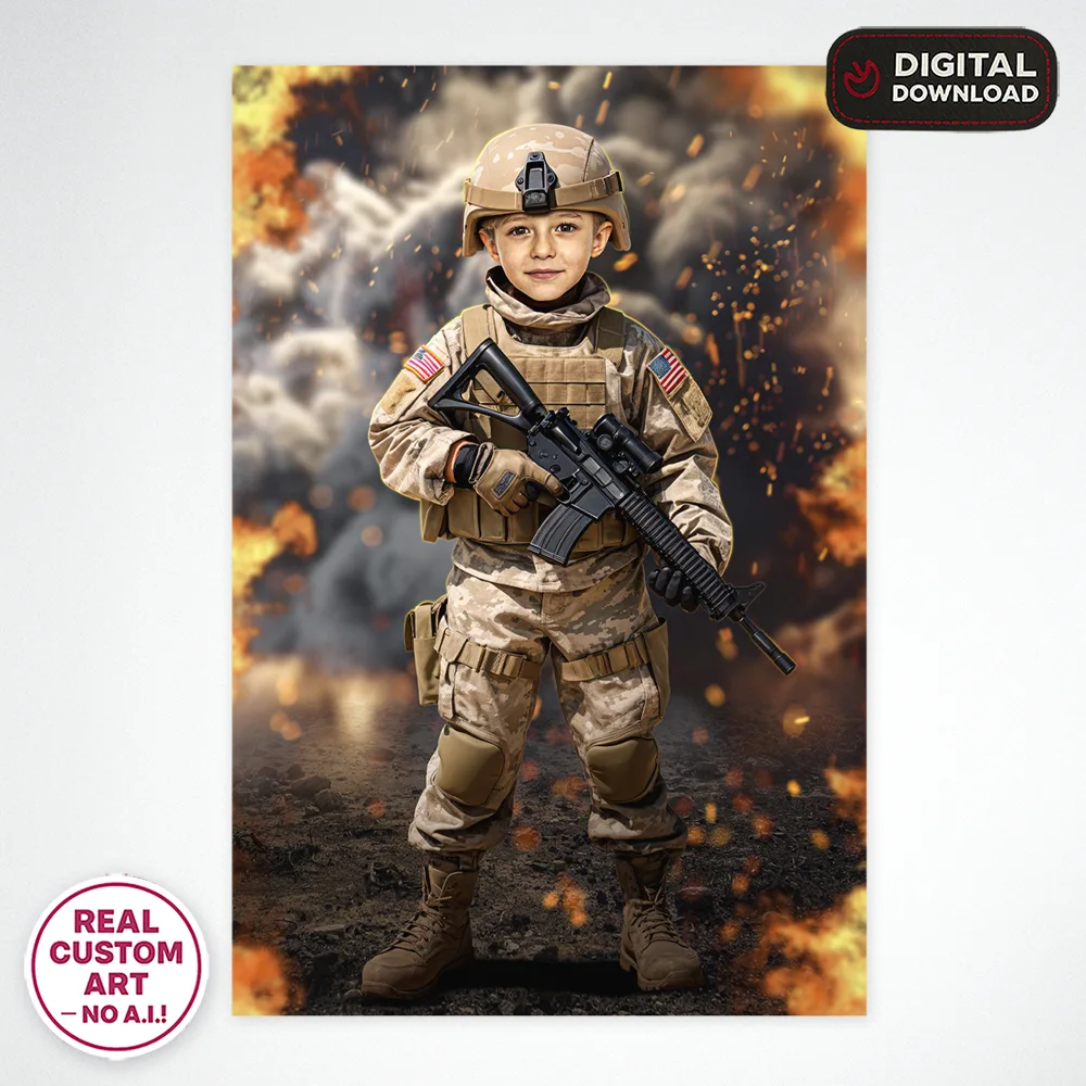 You’ll receive a high-resolution JPEG file (300 DPI) customized with your child’s photo, placed into a detailed soldier uniform and military-themed scene. The standard size is 8×10 inches, but custom dimensions are available upon request.