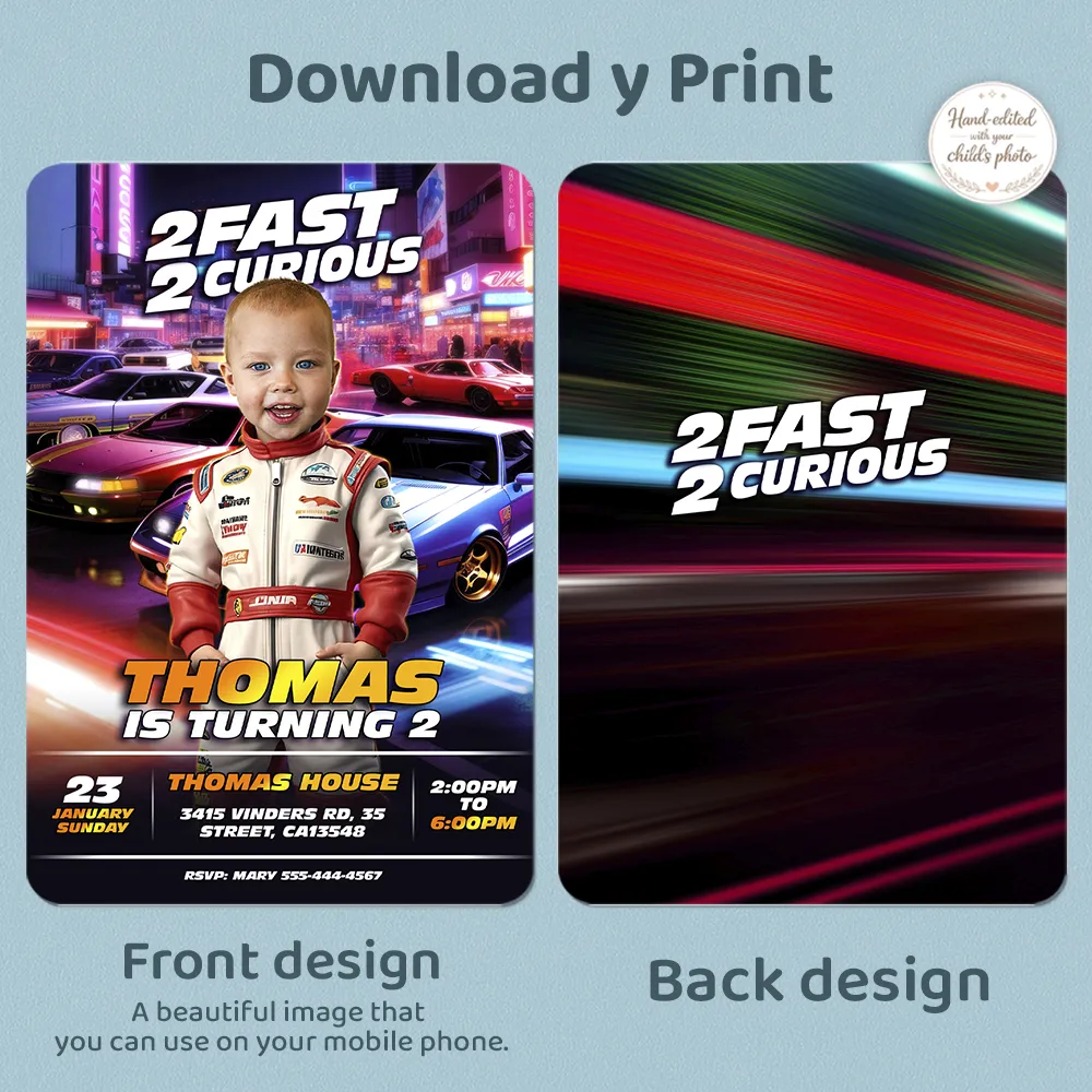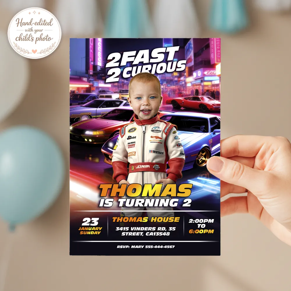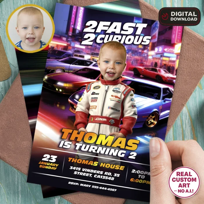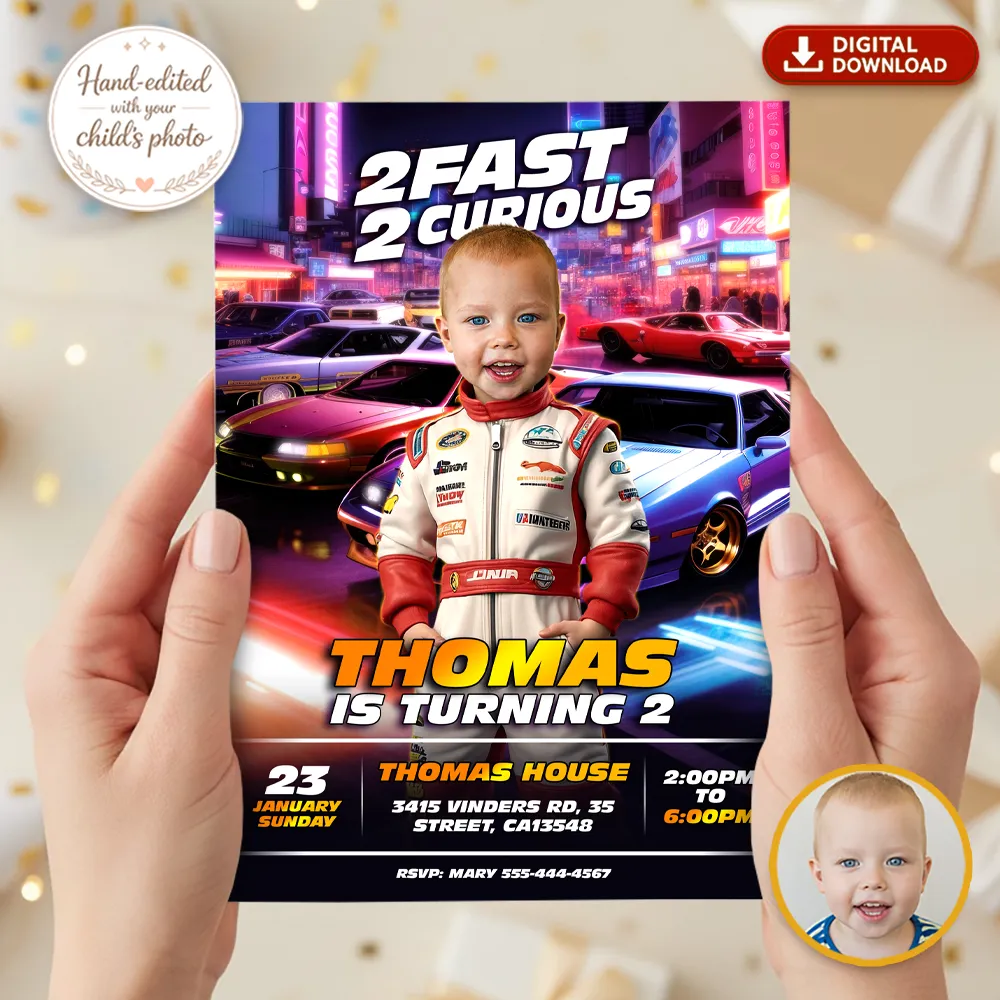 What makes our “Two Fast” invitations the best on the market? Our professional manual photo editing. We don’t just crop a face; our designers manually integrate your child’s photo into the racing suit and helmet, matching the lighting and perspective so they look like a real racing champion ready for their second lap around the sun. No AI, no automated apps—just 100% custom digital artistry.