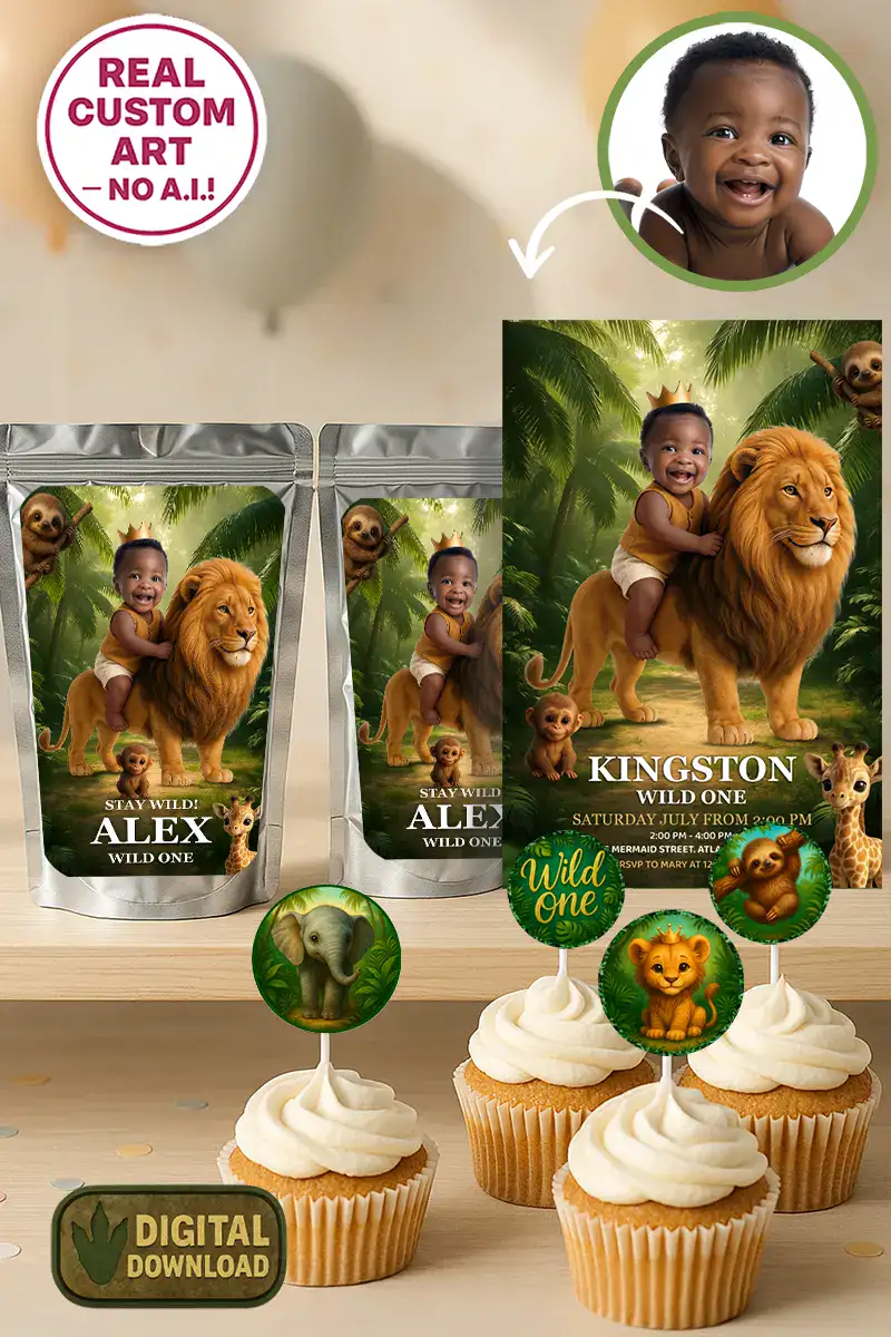 Yes — our Wild One Lion Collection includes invitations, banners, welcome signs, cupcake toppers, and thank-you tags to complete your entire party setup.