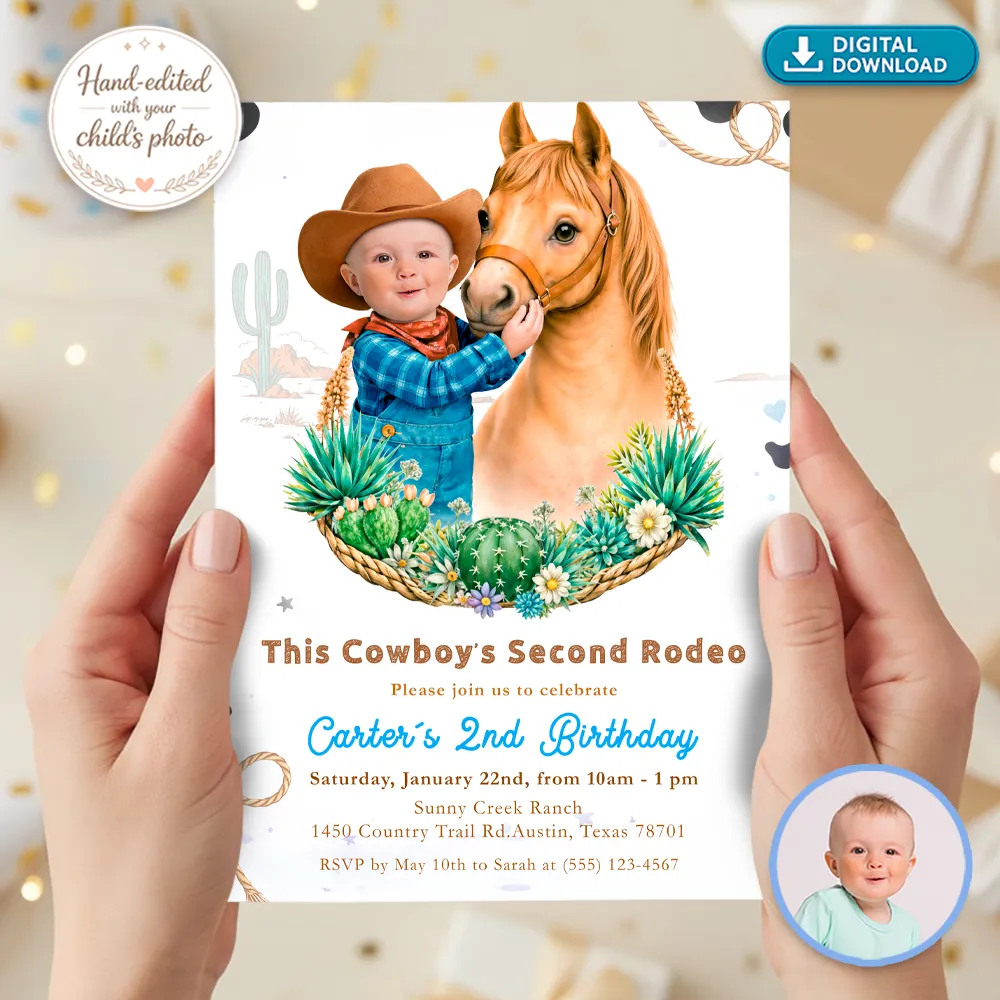 Whether it’s a First Rodeo or a 2nd Birthday, this “Little Rider” design is a total showstopper. We specialize in professional manual photo editing, meaning we don’t just “cut and paste”; we carefully integrate your child’s face into the cowboy character to make it look like they are truly in the middle of the action!