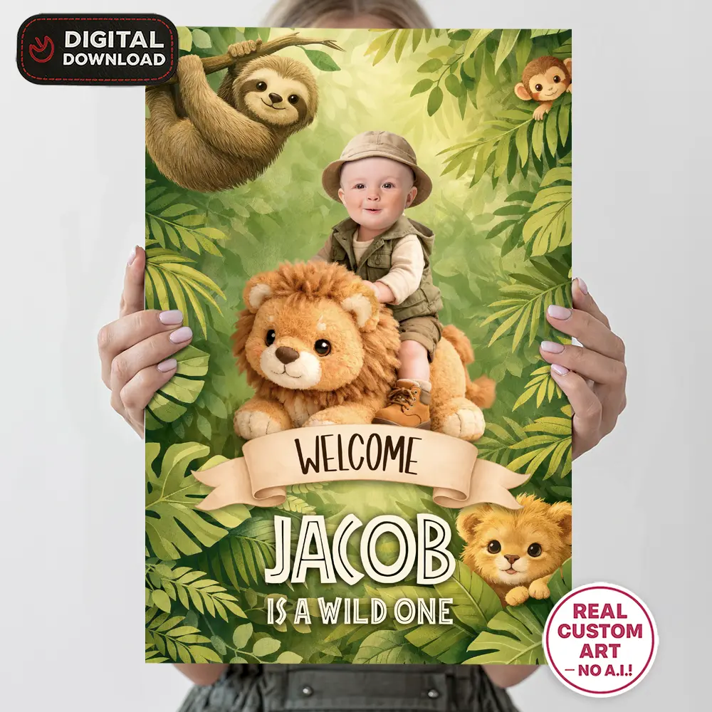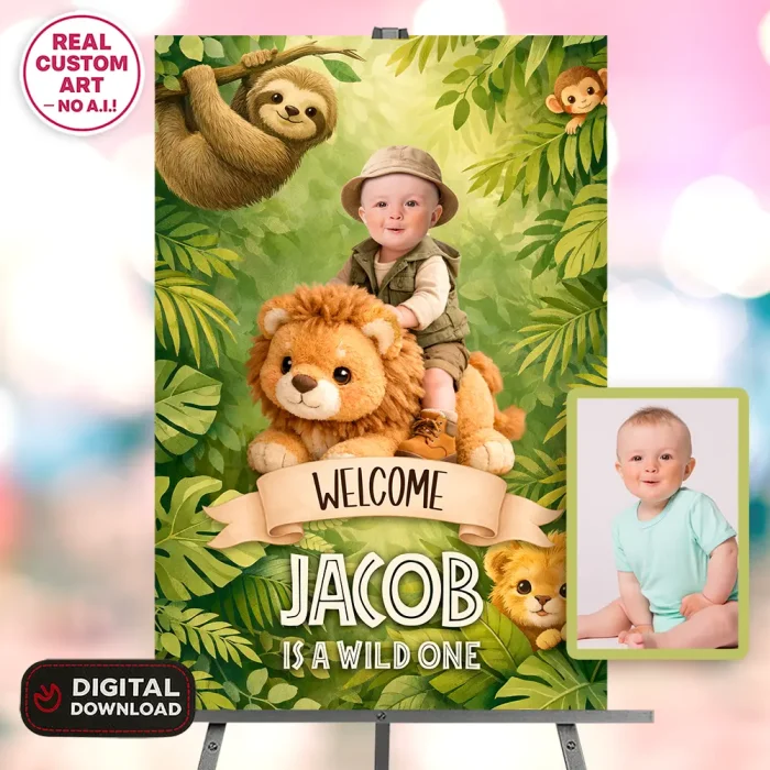 Cute Jungle Welcome Sign – Personalized Wild One Party Decor With Photo (24h Delivery) – Digital Download