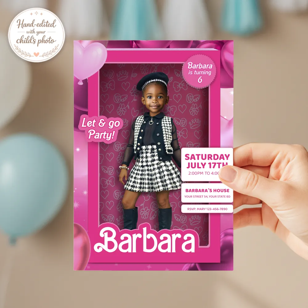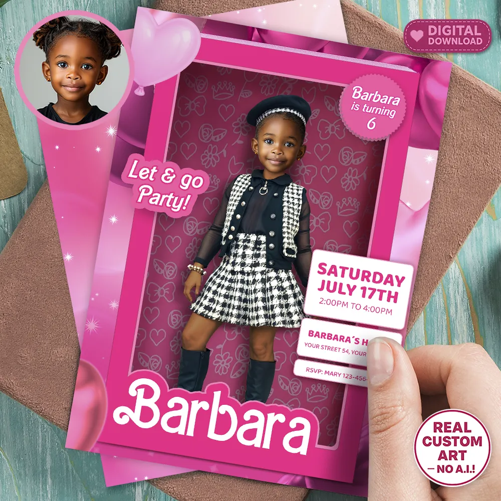 The magic of our invitations lies in our expert manual photo editing. Unlike generic templates, we take the time to hand-craft every integration. Our designers manually blend your child’s photo into the fashion-themed background, carefully adjusting the color balance and lighting to match that signature “iconic pink” glow. We don’t use AI filters; we provide a high-definition, professional result that looks like it came straight from a luxury fashion studio.