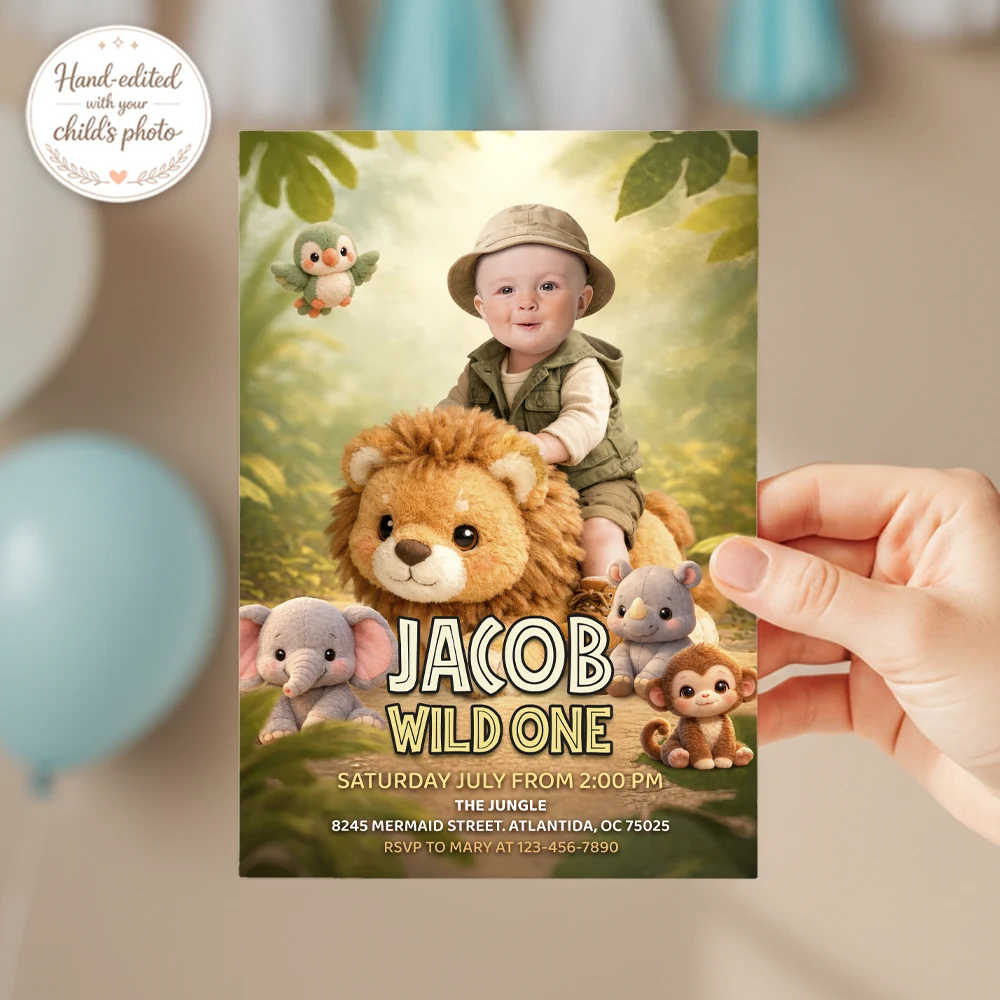 Cute Wild One Birthday Invitation | Custom Baby Plush Lion Photo Invite