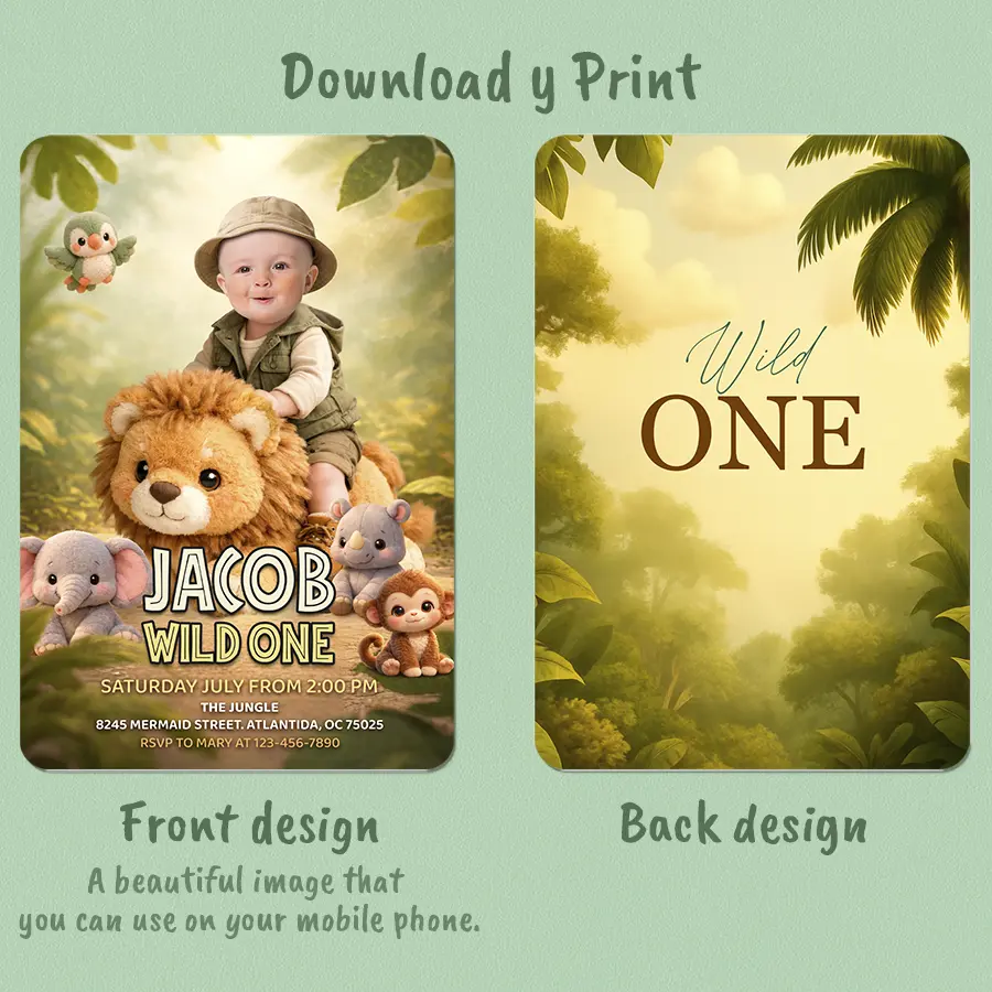 Celebrate the biggest milestone with the cuddliest theme! Our Cute Wild One Birthday Invitation features a heartwarming scene where your baby is sitting on a giant, soft plush lion, surrounded by adorable stuffed animal friends from the jungle. It’s a magical and cozy take on the “Wild One” theme, perfect for creating a gentle and loving atmosphere for a first birthday.