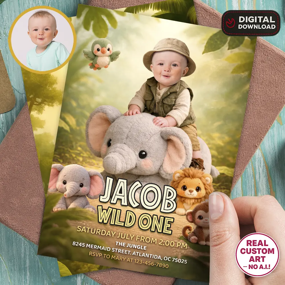 🌿 An Unforgettable First Adventure! Our Custom Wild One Photo Invitation with a Plush Elephant.