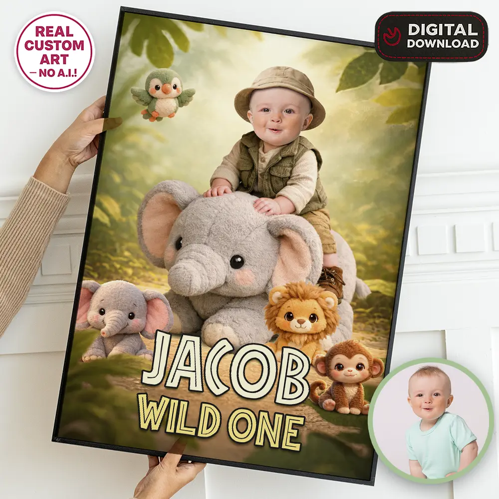 We place your child in a refined jungle/safari scene with watercolor-style greenery, pampas grass, soft gold/khaki accents, and friendly animals (giraffe, elephant, lion, zebra — choose your favorites). Subtle paper grain and gentle rim lighting make the print look photography-ready while preserving natural skin tones.