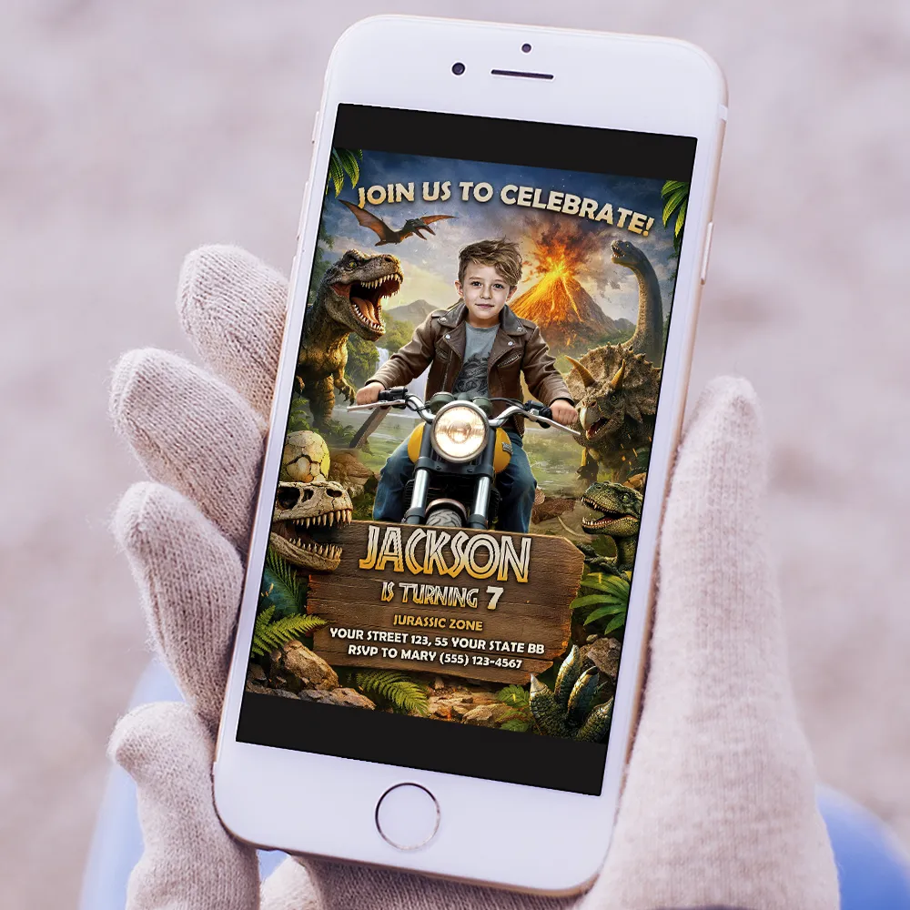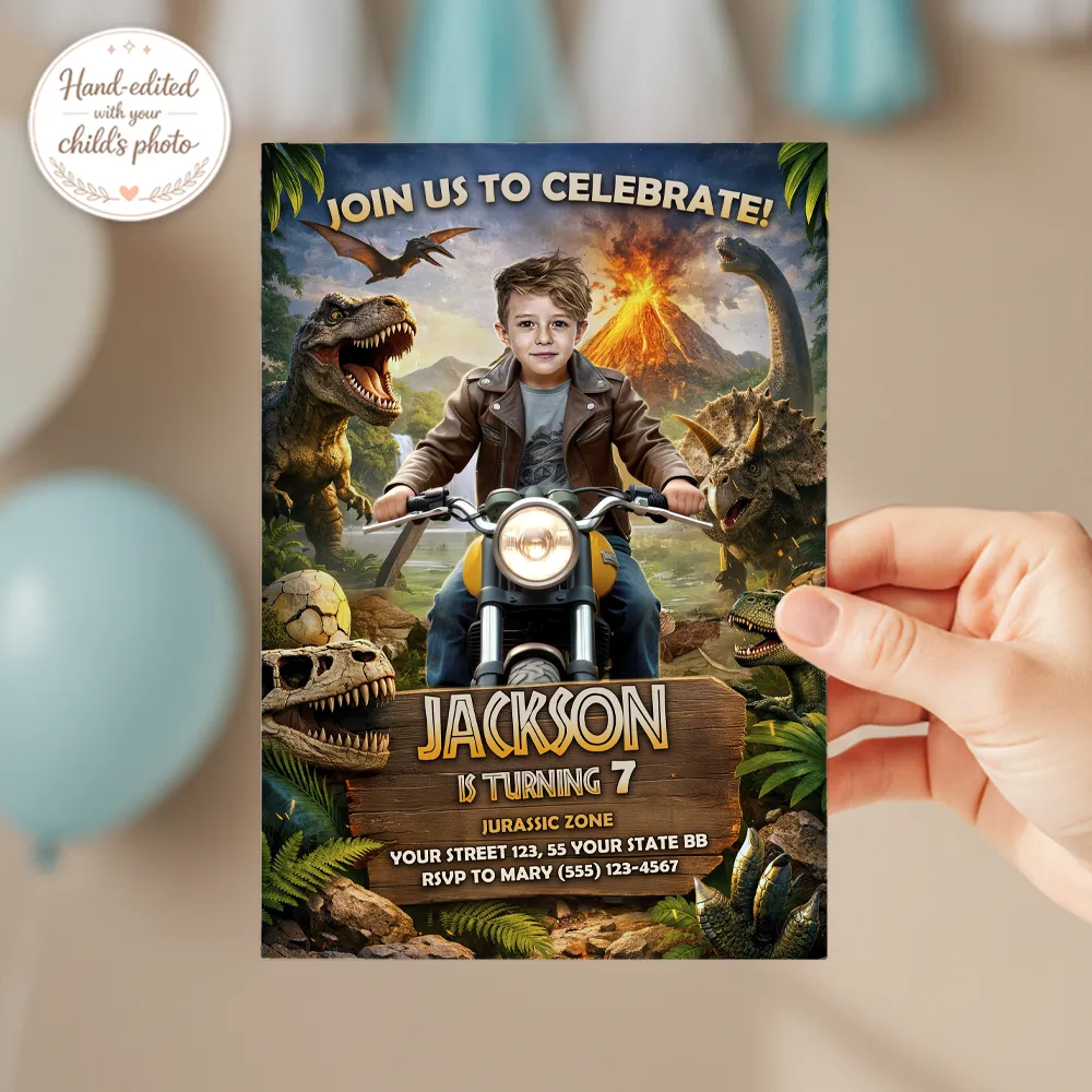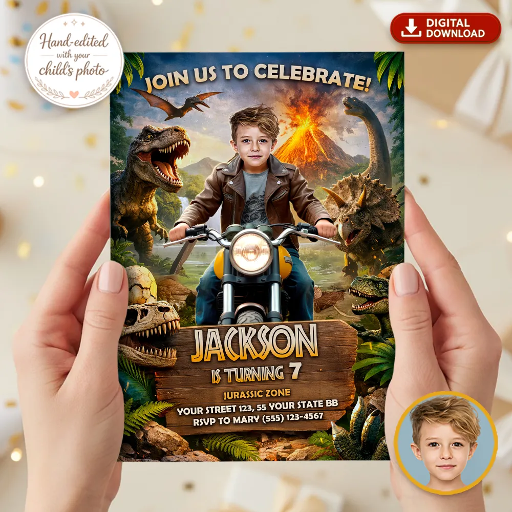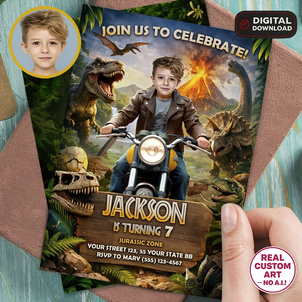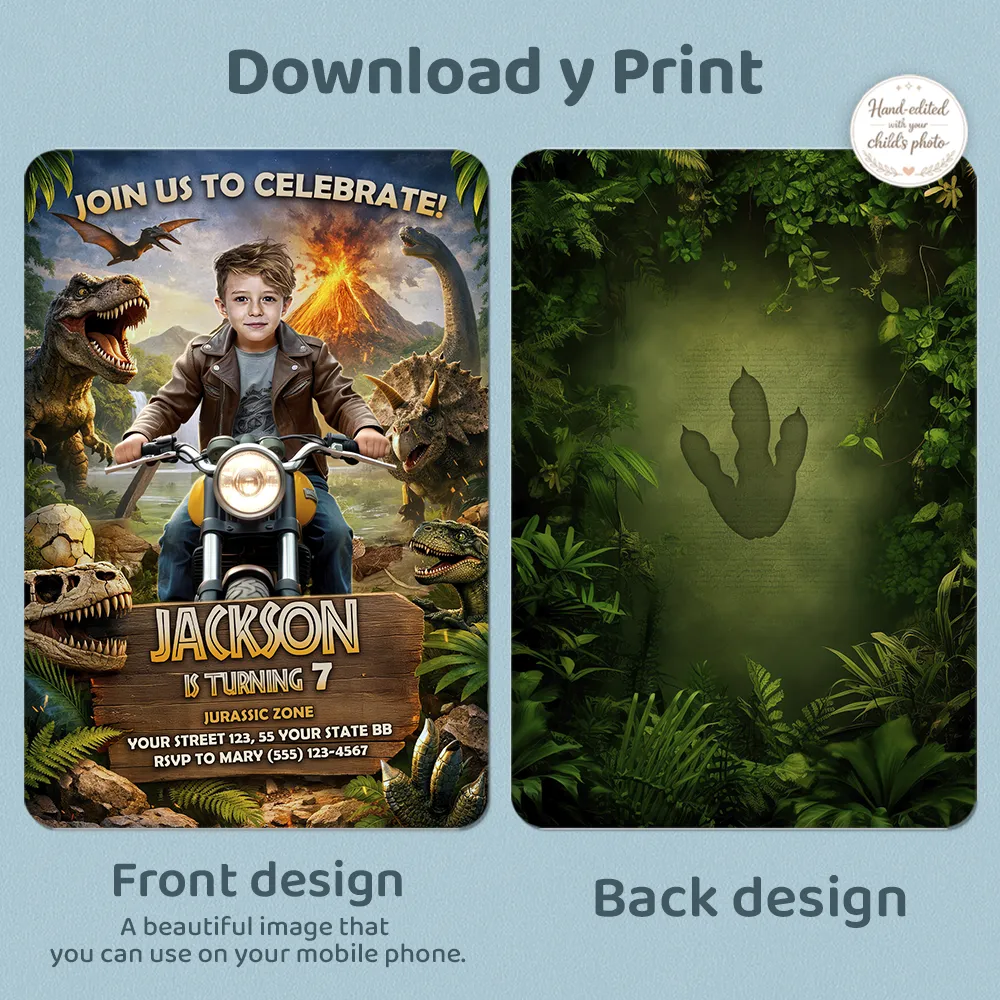 You’ll get a high-resolution JPEG file (300 DPI) personalized with your child’s photo, name, age, and party details in a bold Jurassic Dinosaur Moto theme. Standard size is 5×7 inches, ideal for printing or digital sharing.
