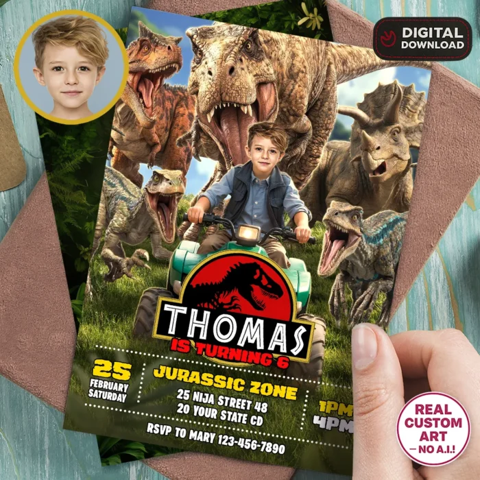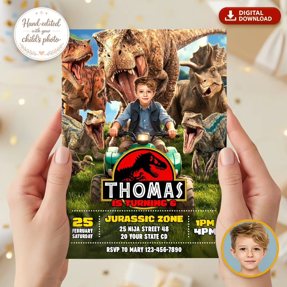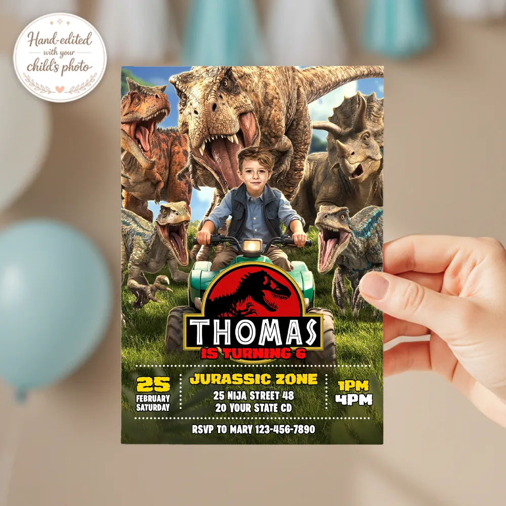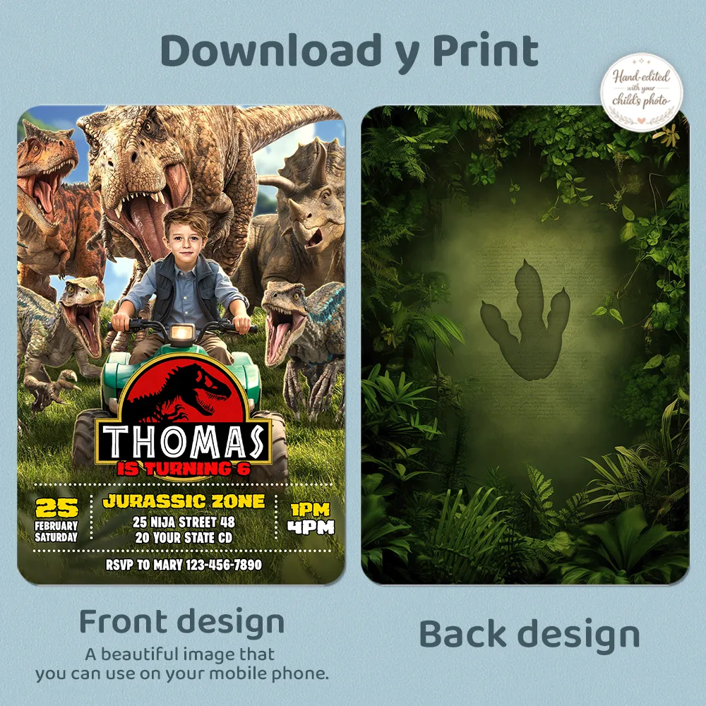 You’ll get a high-resolution JPEG file (300 DPI) personalized with your child’s photo, name, age, and party details in a Ranger & Raptor Jurassic Explorer theme. Standard size is 5×7 inches, ideal for printing or digital sharing.