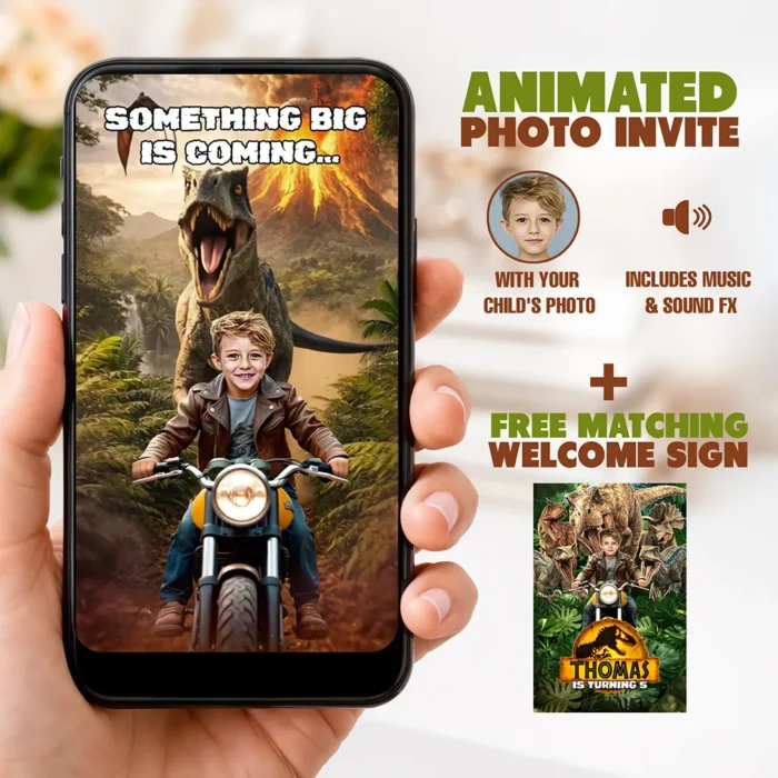 Get ready for a ROAR-some celebration! This animated dinosaur birthday invitation video brings the adventure to life with your child as the star of the show. Perfect for dinosaur lovers and Jurassic-themed parties, this exciting digital invite features animation, sound effects, and music for a fun, cinematic experience.