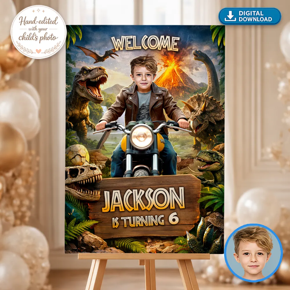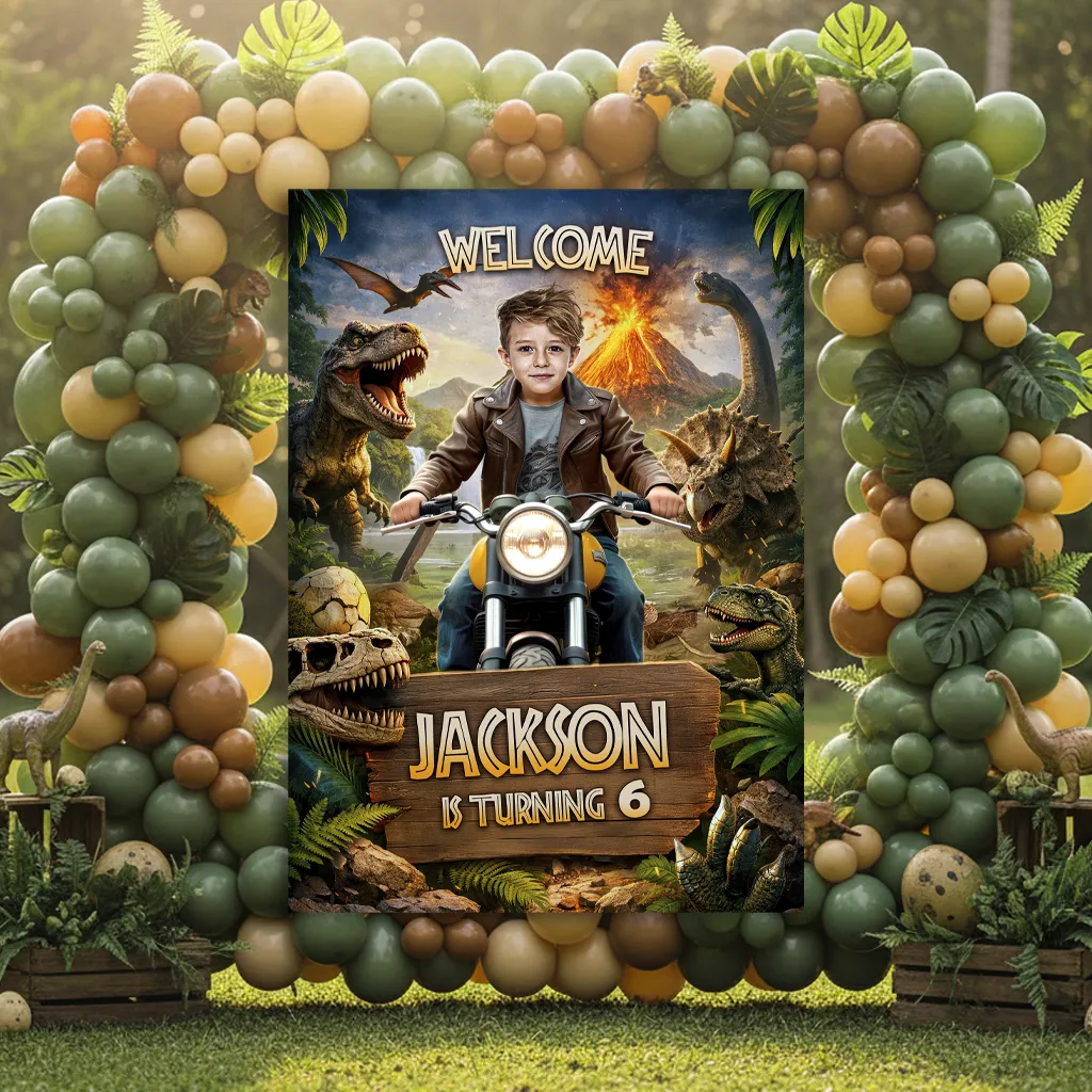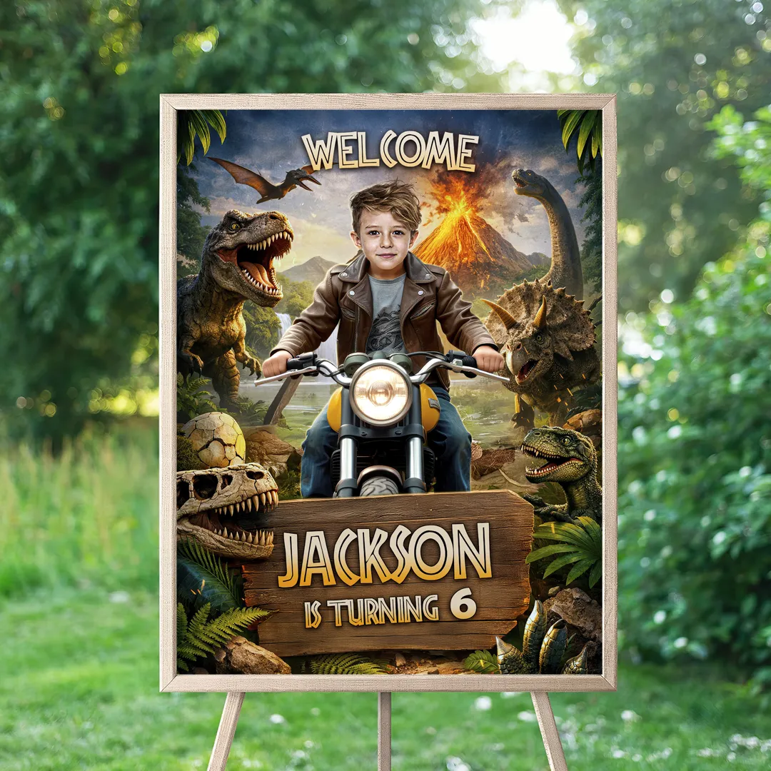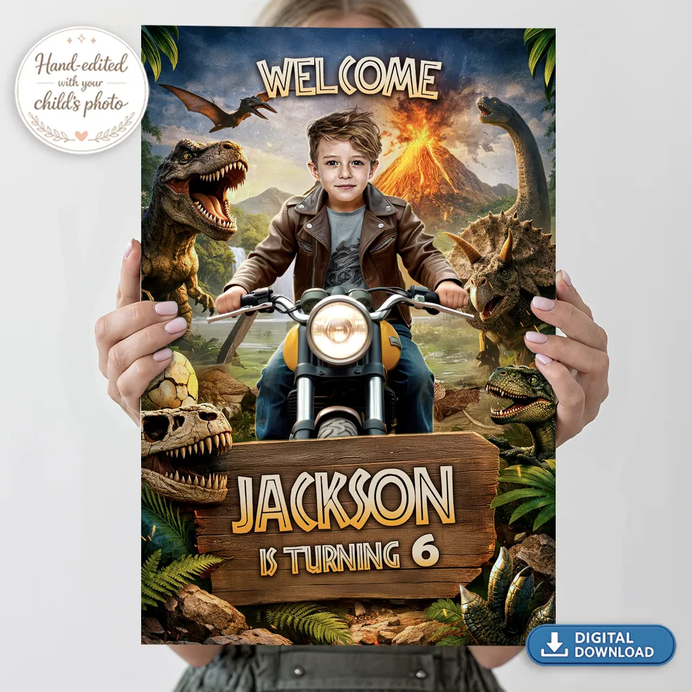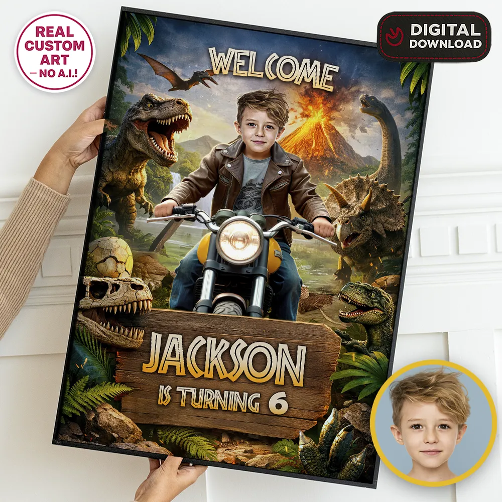 🦖 Fast track to the Jurassic! Your little racer is leading the way in this epic dino-moto welcome poster.