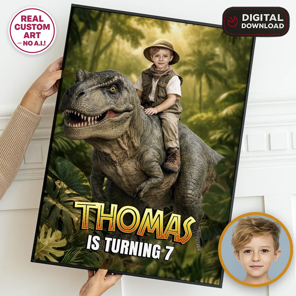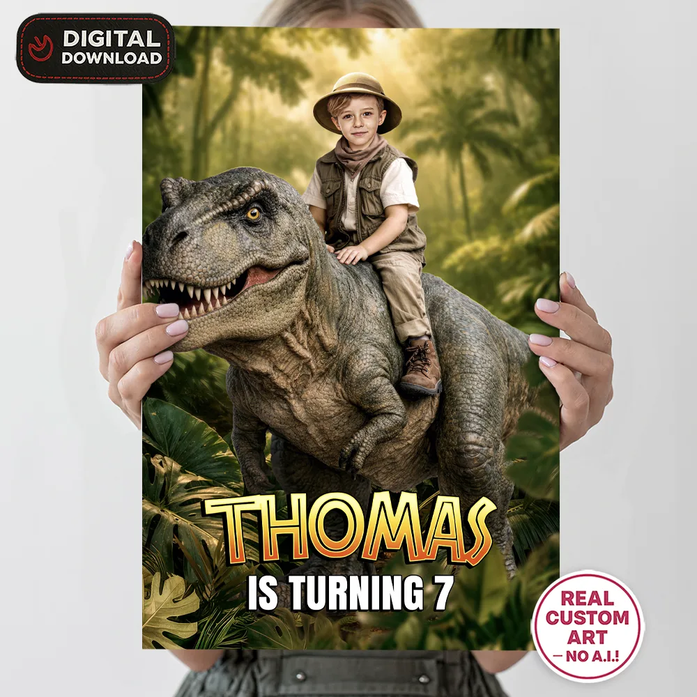 Dinosaur Welcome Sign With Photo – custom party poster featuring your child riding a T-Rex with a dinosaur stampede behind. Ready to print in 24h!