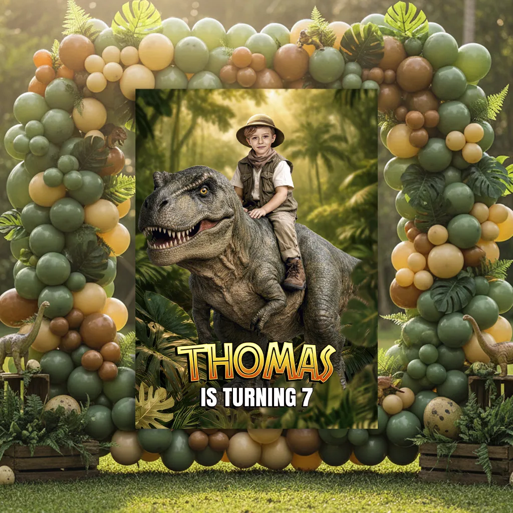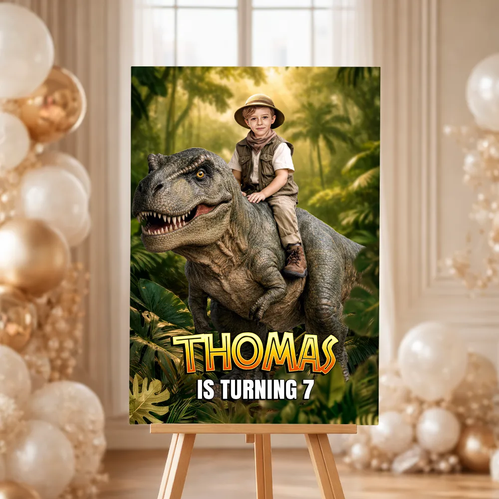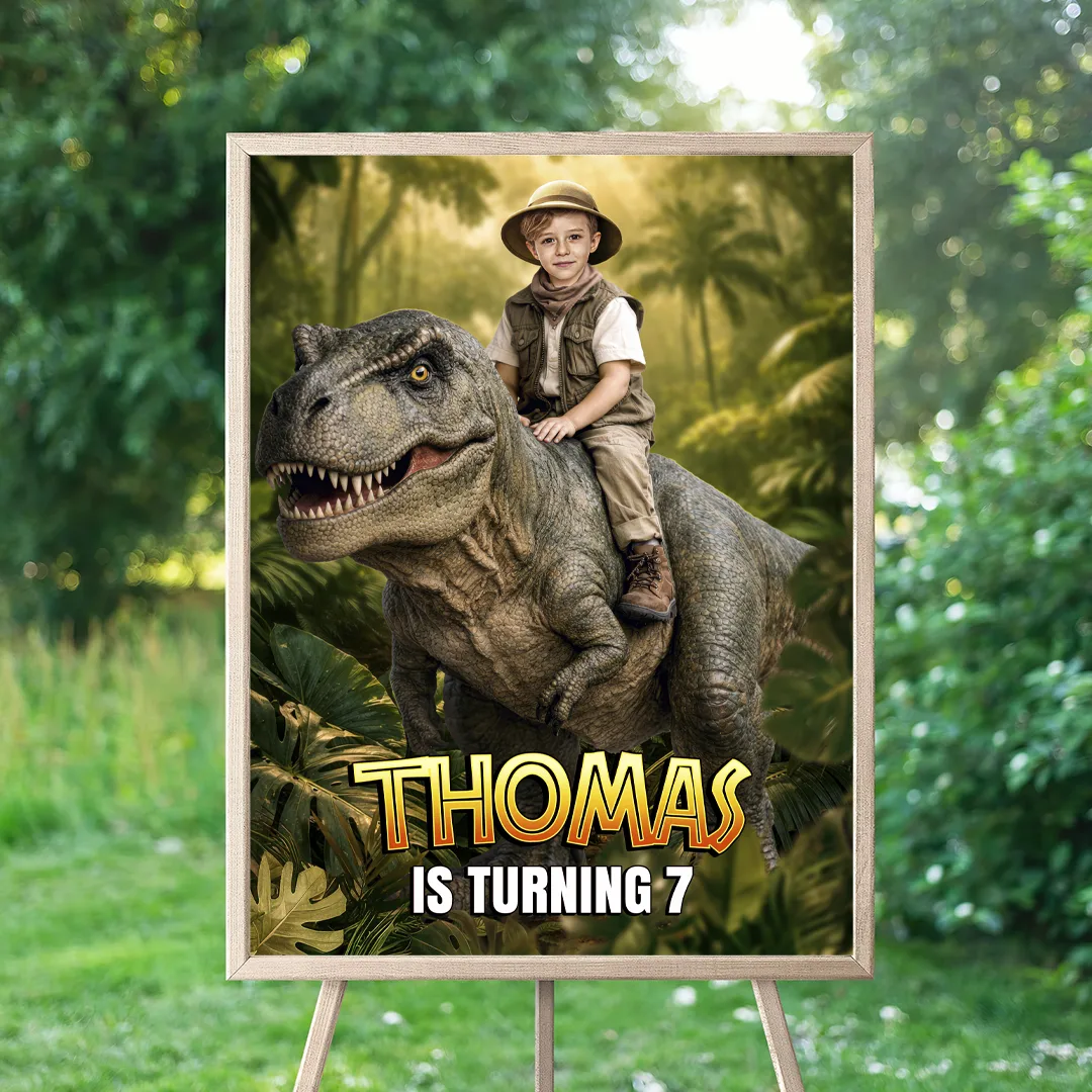 Turn your child’s birthday into a prehistoric race with our Custom Dinosaur Welcome Sign With Photo!