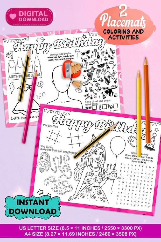This printable set includes 2 unique activity pages designed for girls’ birthdays, filled with fun games, coloring sections, and cute doll illustrations that kids will love.
