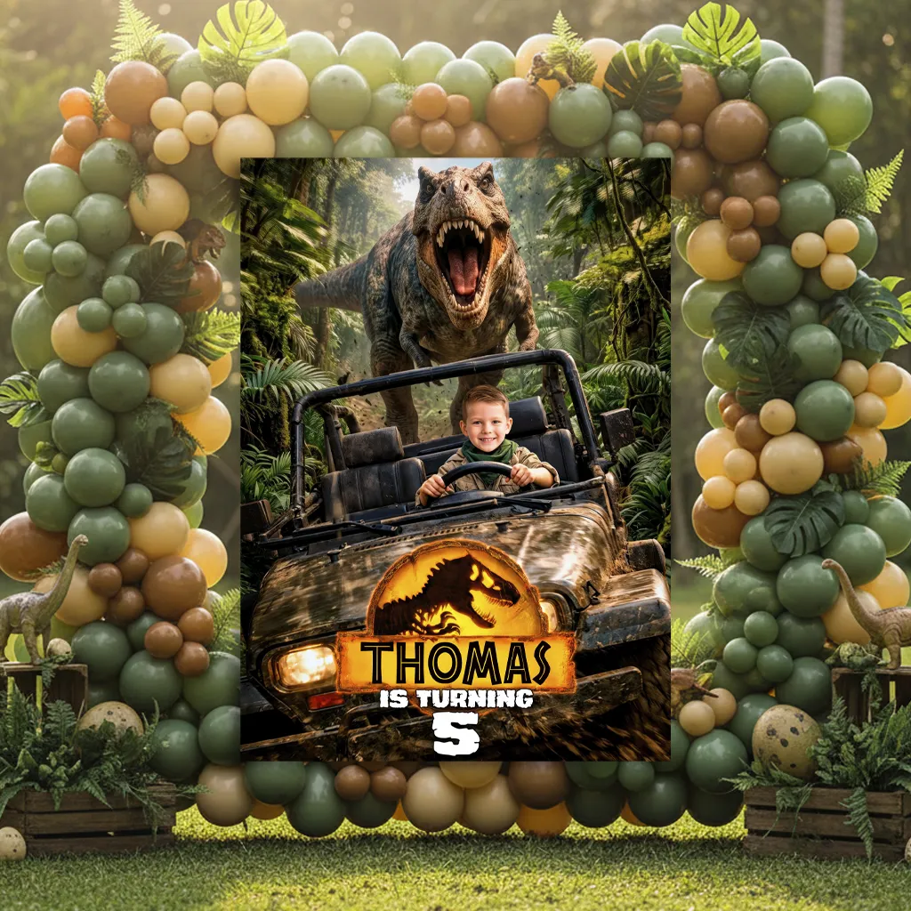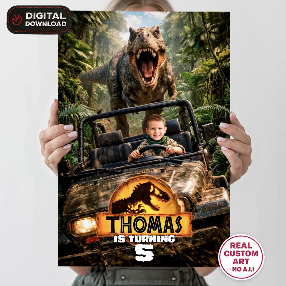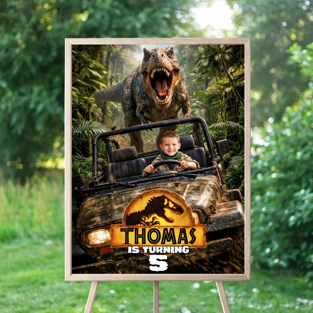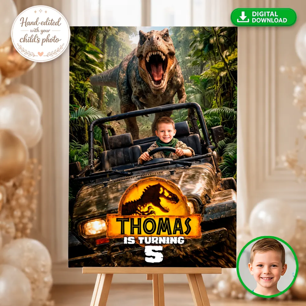 We are specialists in professional manual photo editing. We don’t just “drop” a photo into a template; our designers manually work on your child’s image to integrate it perfectly into the Jurassic landscape. We ensure the lighting, colors, and resolution are top-notch, making your little one the true star of the event.