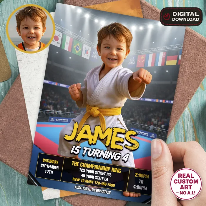 Epic Karate Birthday Invitation personalized with your child’s photo. Hand-edited in Photoshop, no templates or AI. Perfect for martial arts parties. Fast 24h delivery.