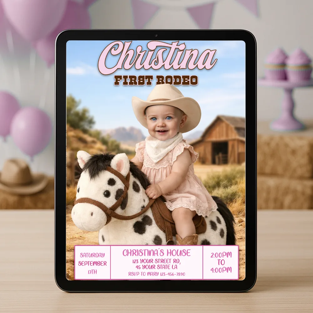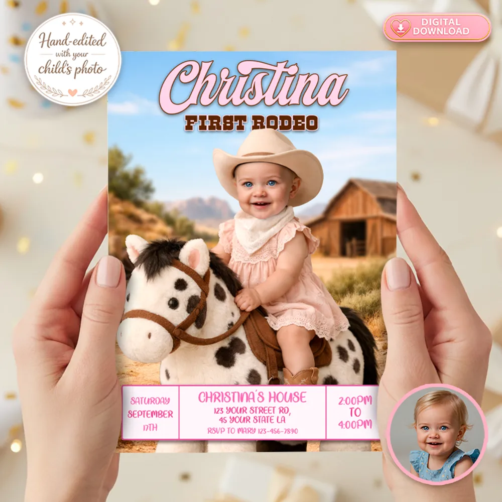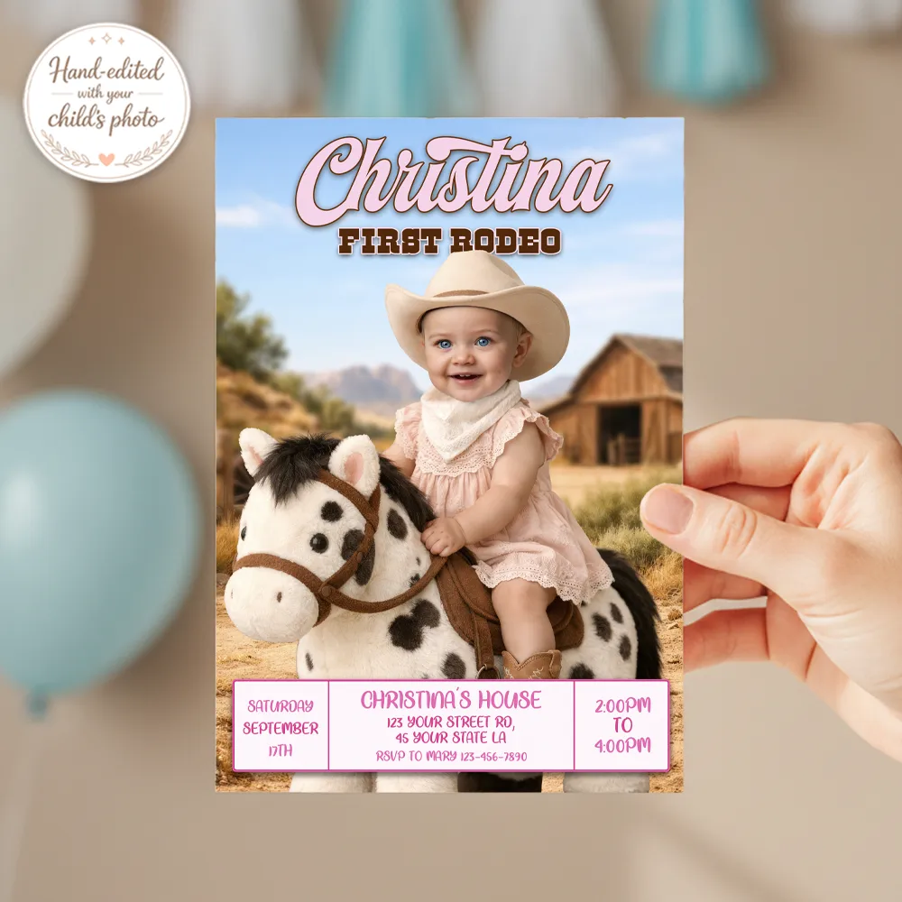 First Rodeo Invitation for Girls – Custom Pink Cowgirl Photo Invitation – Delivered in 24h – Digital File