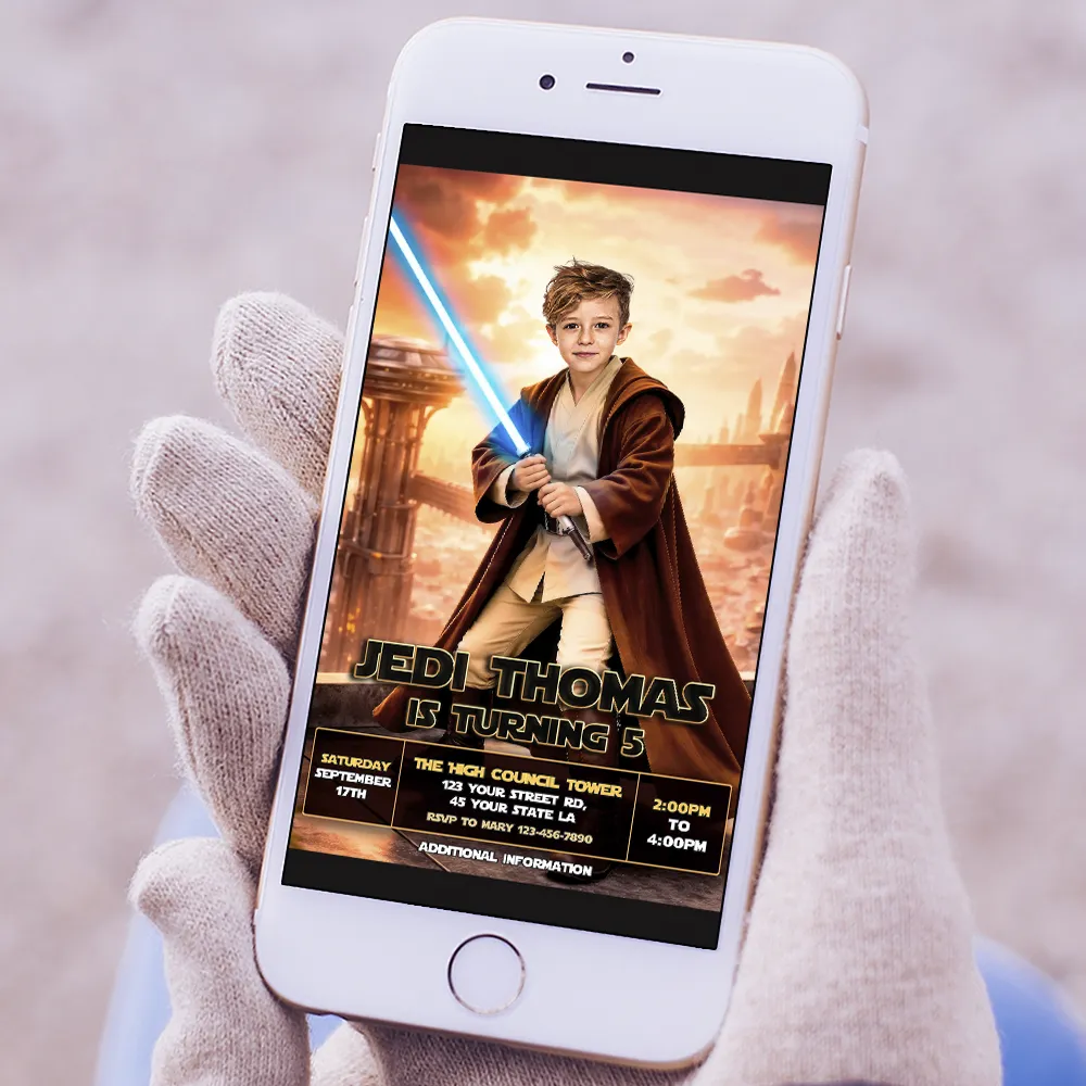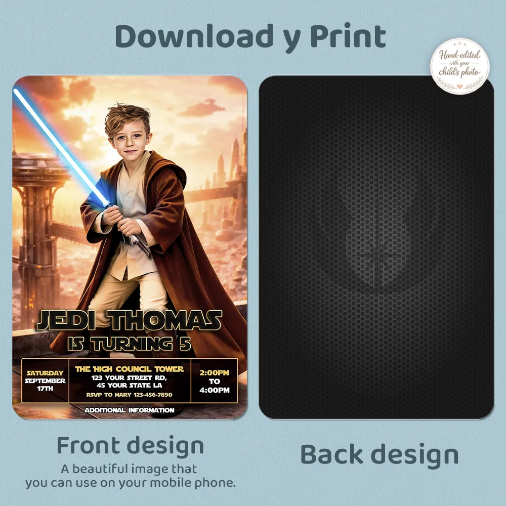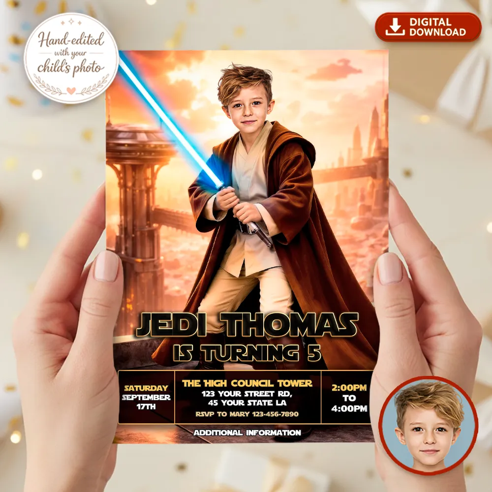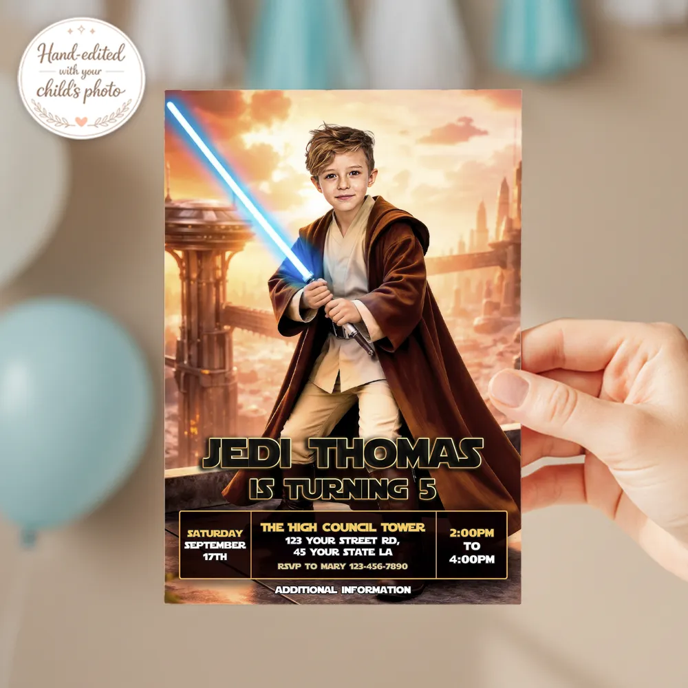What makes our invitations truly powerful? Our expert manual photo editing. We don’t rely on AI filters or automatic templates. Our designers carefully integrate your child’s face into the heroic character, adjusting light effects, shadows, and color tones to create a seamless, cinematic look. The result is bold, dynamic, and professionally crafted — as if he just stepped into his own galactic saga.