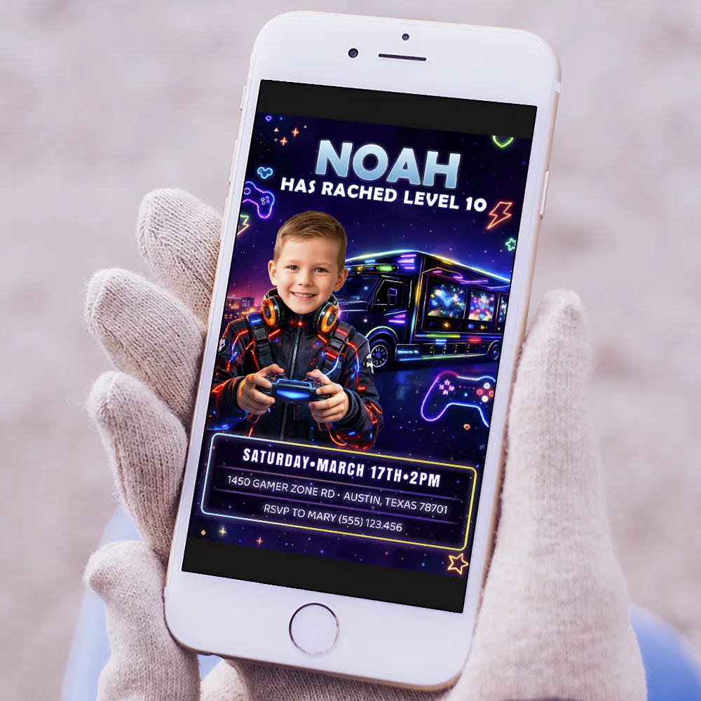 Custom Gamer Truck Birthday Photo Invitation | Personalized Neon Gaming Party Invite