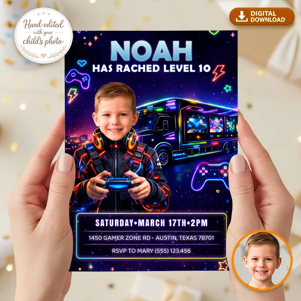 Fully Personalized – Your child’s face and party details integrated into a realistic neon gamer truck scene.