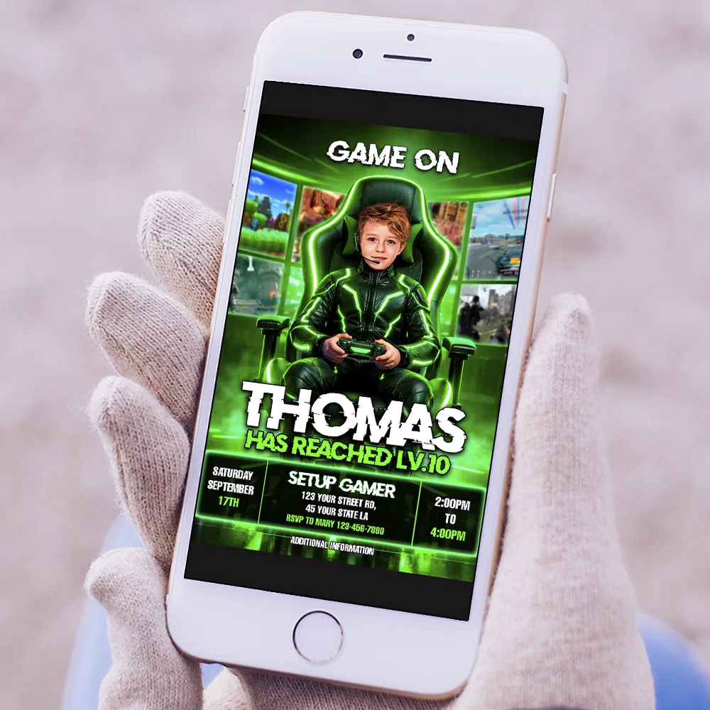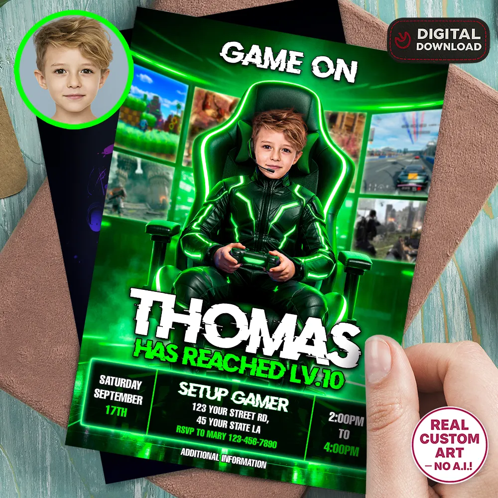 ✨ Level up your child’s birthday with this Personalized Green Gamer Birthday Invitation! Fully personalized with your child’s photo, this design transforms them into a gaming champion on their very own throne — the ultimate way to kick off an epic party.