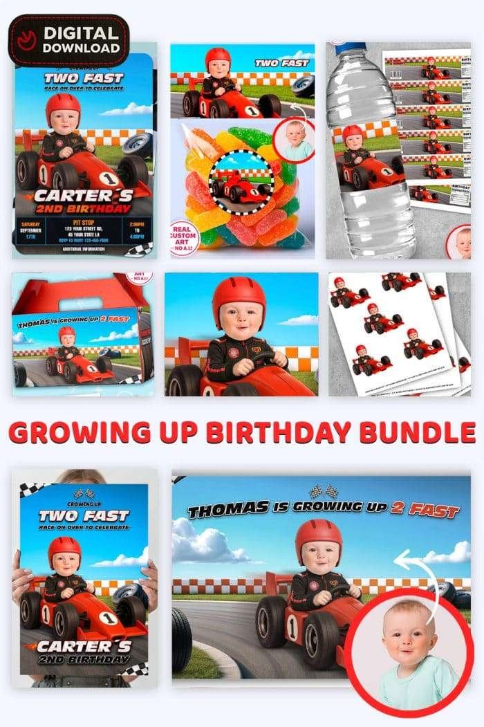 Rev up the excitement with our Growing Two Fast Birthday Party Bundle — a fully coordinated digital party set where your little one becomes the star of the race! Every item in this high-energy collection features your child as part of a dynamic race car scene, delivering a cohesive look that your guests will love.