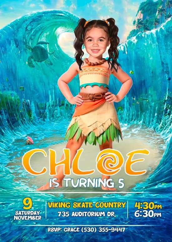 Every invitation is 100% handcrafted in Photoshop by a professional designer. We never use AI or generic templates. Your child’s photo is lovingly edited into the tropical island scene with natural proportions, soft glowing light, and seamless artistic integration for an authentic cinematic result.