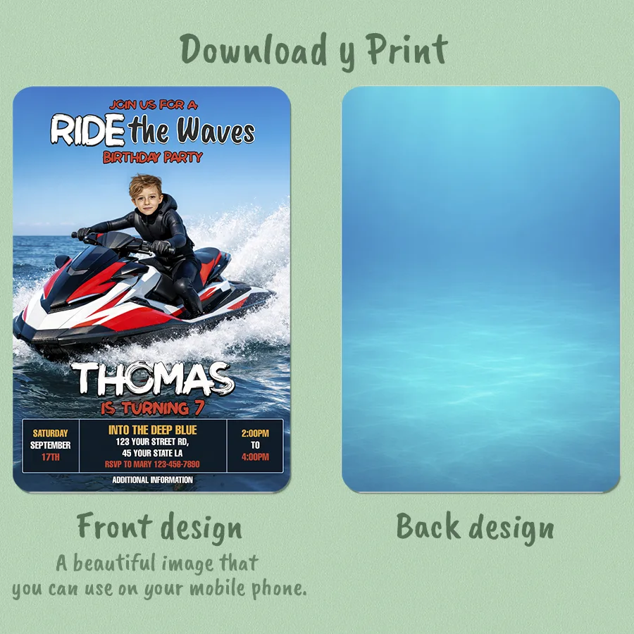 Jet Ski Birthday Invitation with photo, personalized and hand-edited (no AI). Digital download delivered in 24h—perfect for a modern ocean action birthday party.