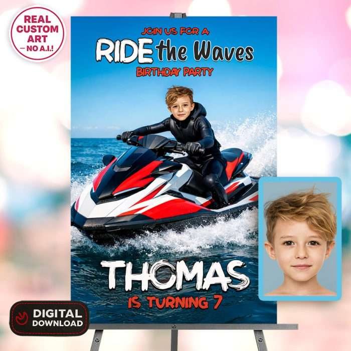 Welcome guests and set the tone for an unforgettable celebration with a Jet Ski Photo Welcome Sign for kids.