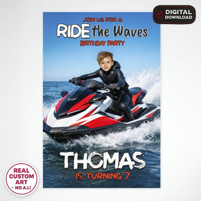 Each sign is individually hand-edited — no AI, no templates — placing your child into an exciting jet ski scene inspired by movement, speed, ocean spray, and bold, high-impact typography.