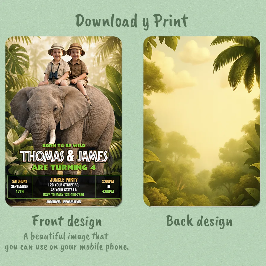 Jungle Birthday Invitation with Photo (Siblings / Twins / Friends) — a sweet and adventurous jungle-inspired design featuring two (or more) children together with a gentle elephant, perfect for siblings’ birthdays, twins celebrations, or best friends sharing a special day.