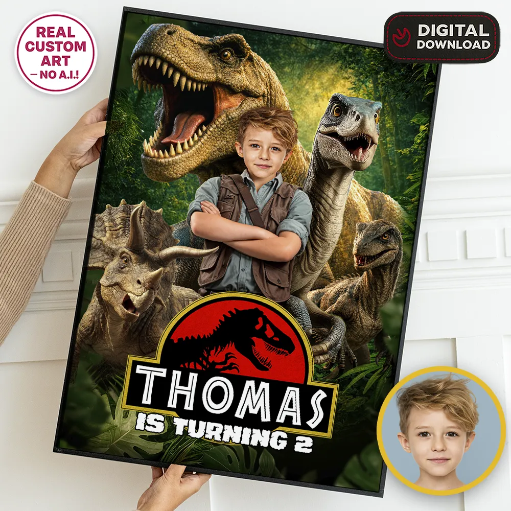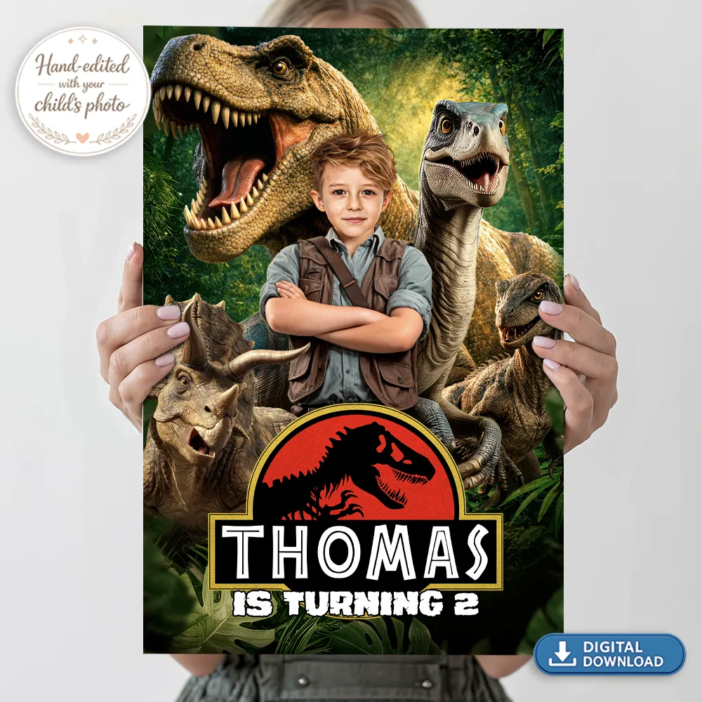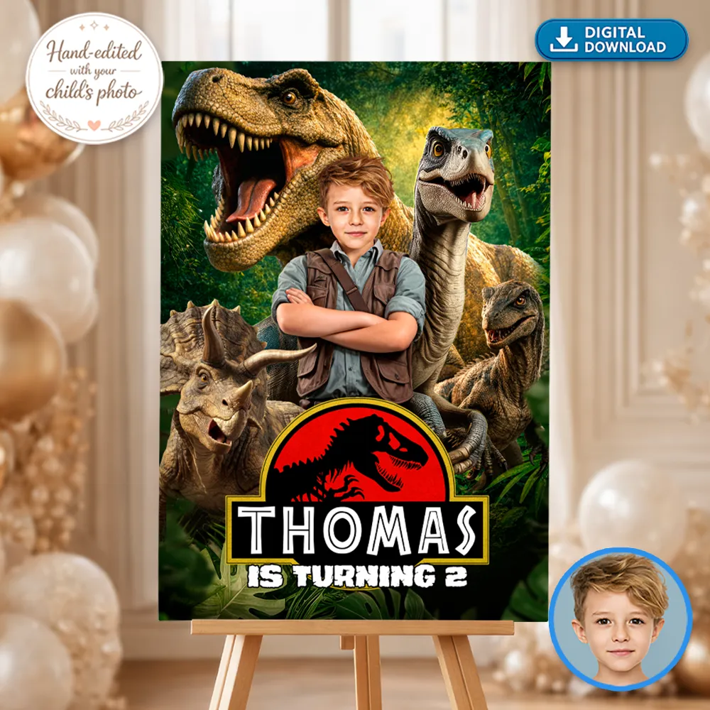 The secret to our high-impact welcome signs is our expert manual photo editing. Because these signs are designed for large-scale printing (like posters or foam boards), clarity is everything. Our designers manually integrate your child’s photo into the driver’s seat of the Raptor, adjusting the jungle shadows and the golden-hour lighting to create a cinematic look. We don’t use automated AI filters; we hand-craft the high-resolution file to ensure your little explorer looks like a real action hero when printed at full size.