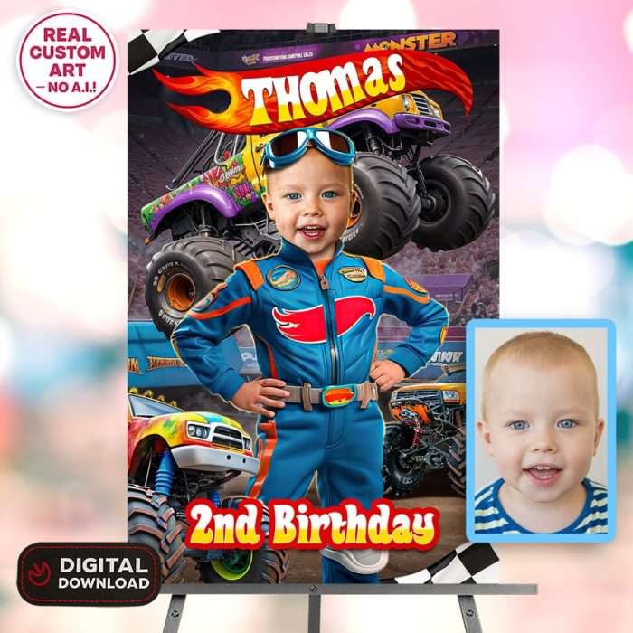 🚗 Monster Truck Turbo Race Welcome Sign – Custom Racing Birthday Decoration With Photo – Delivered in 24h – Digital File