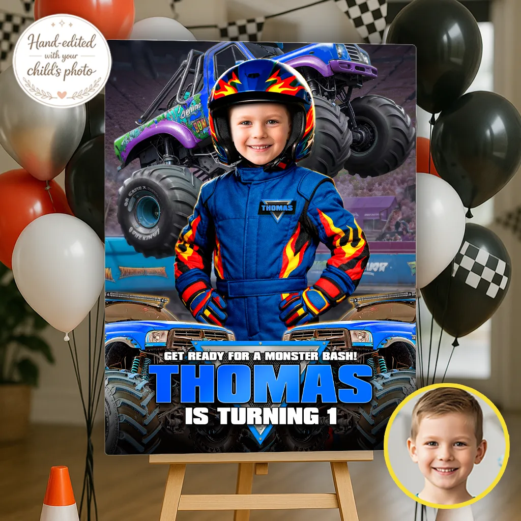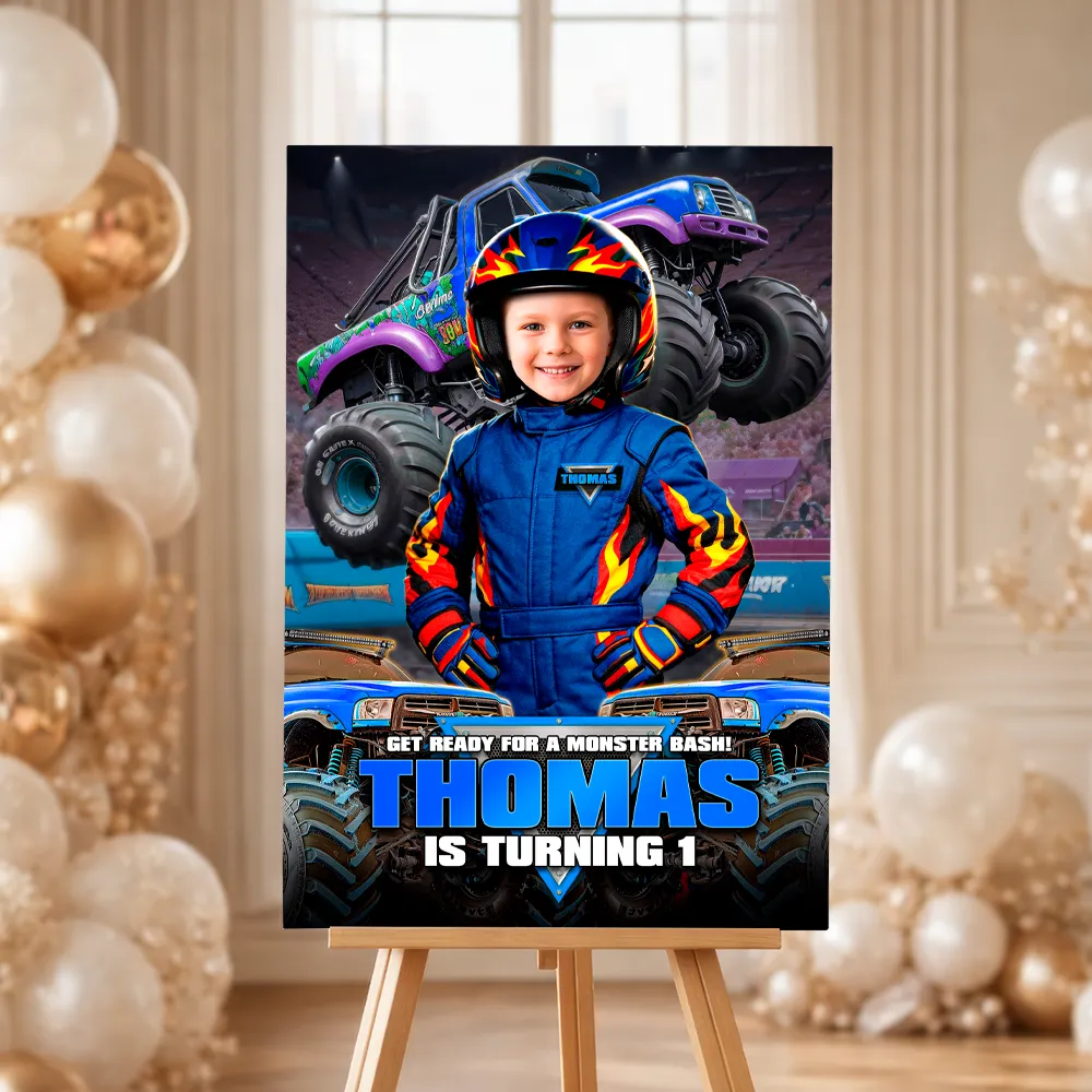 Make a grand entrance that your guests will never forget! Our Personalized Monster Truck Welcome Sign Blue features your child as a professional racing driver, posing next to a powerful blue monster truck in a high-energy stadium. It’s the perfect way to set the mood for an “off-road” adventure and welcome your pit crew to the main event.
