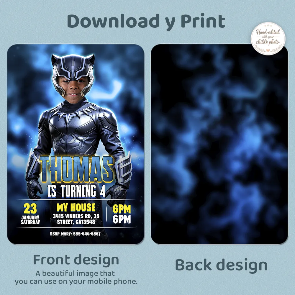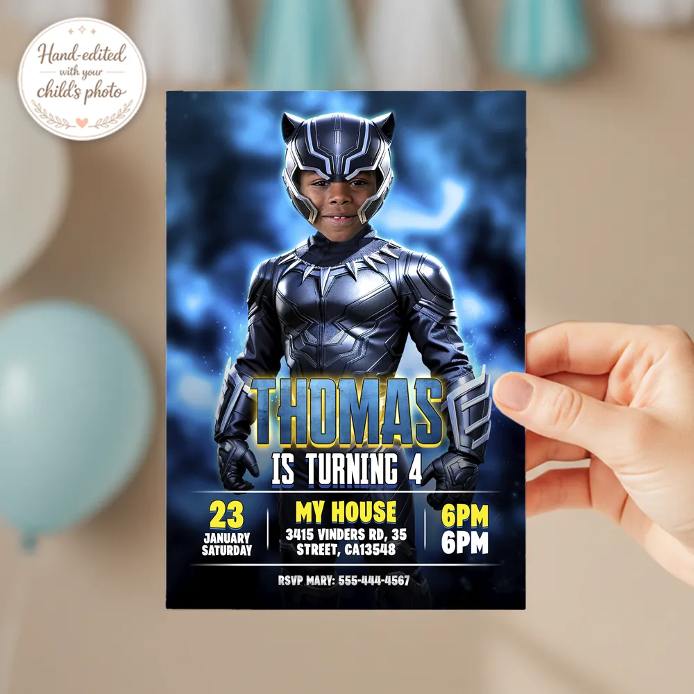The secret to our “top-tier” invitations—and why this design was a bestseller—is our expert manual photo editing. To achieve that cinematic look, our designers manually integrate your child’s face into the panther-style suit and helmet. We meticulously balance the purple glow from the suit with the lighting on the face to ensure a seamless, high-definition result. We don’t use generic AI filters; we hand-craft the integration so your little hero looks sharp, professional, and ready to lead his kingdom to victory.