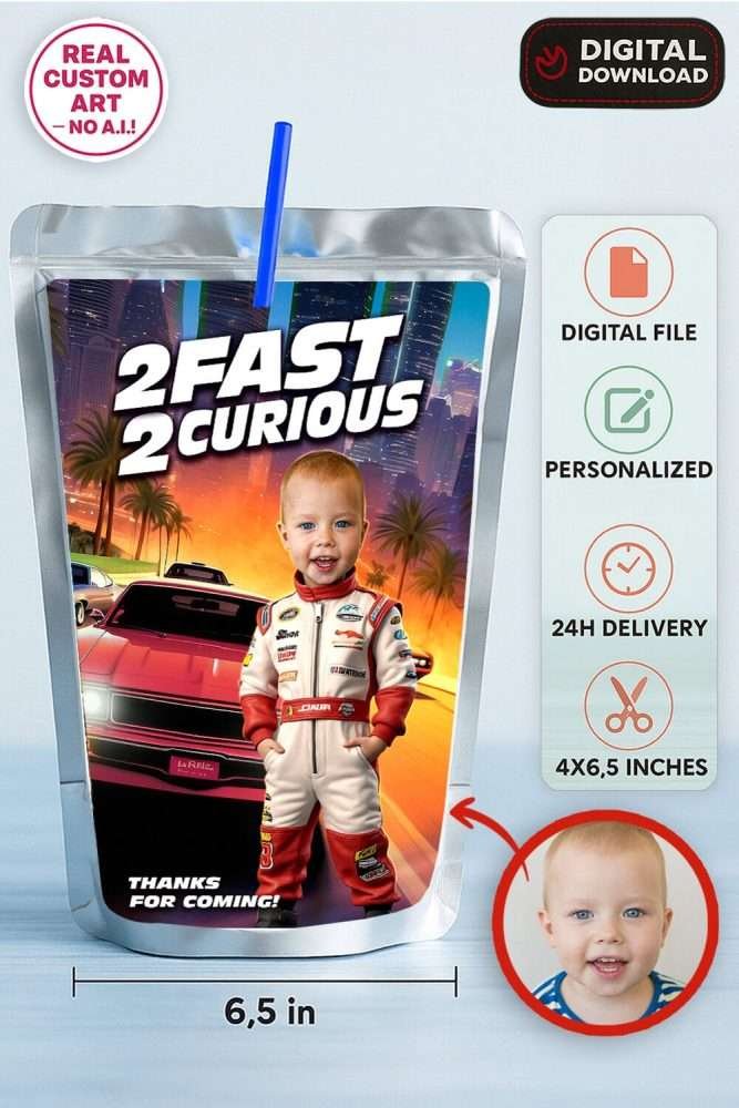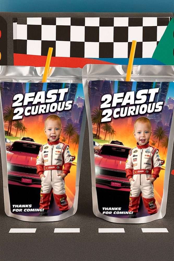 With our 2 Fast 2 Curious Capri Sun Labels, your party drinks will look fun, unique, and perfectly matched to your theme. Each label is personalized with your child’s face, name, and age, giving your celebration a one-of-a-kind touch.