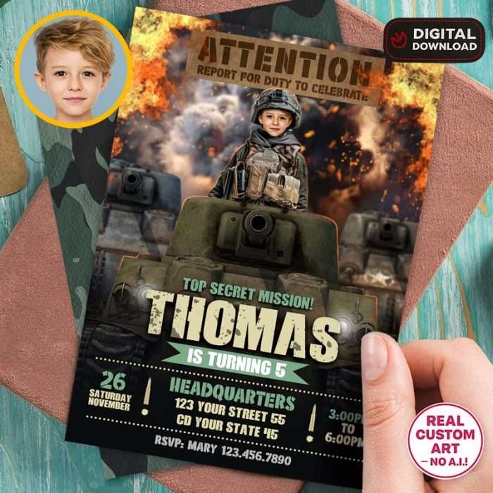 Fully Personalized – Your child’s face and party details integrated into a realistic army scene.