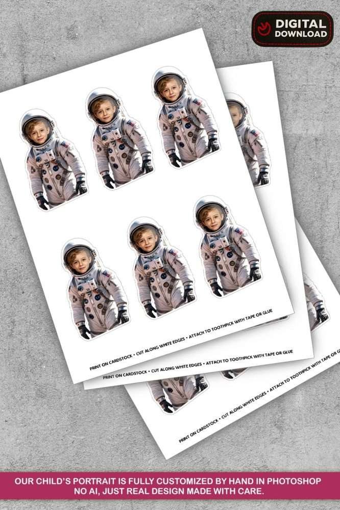 Personalized Astronaut Cupcake Toppers for kids’ birthday parties. Personalized with your child’s photo. 4 per page. Instant digital download. No AI used.