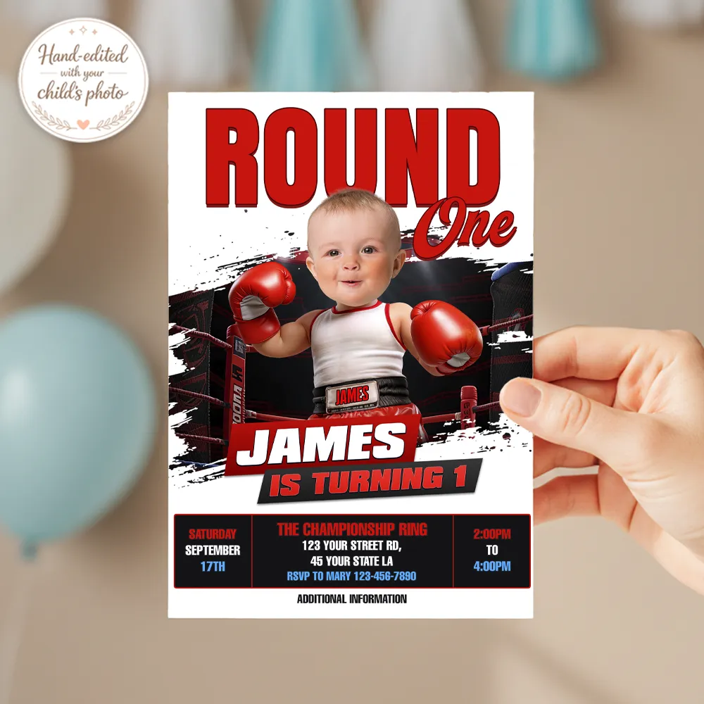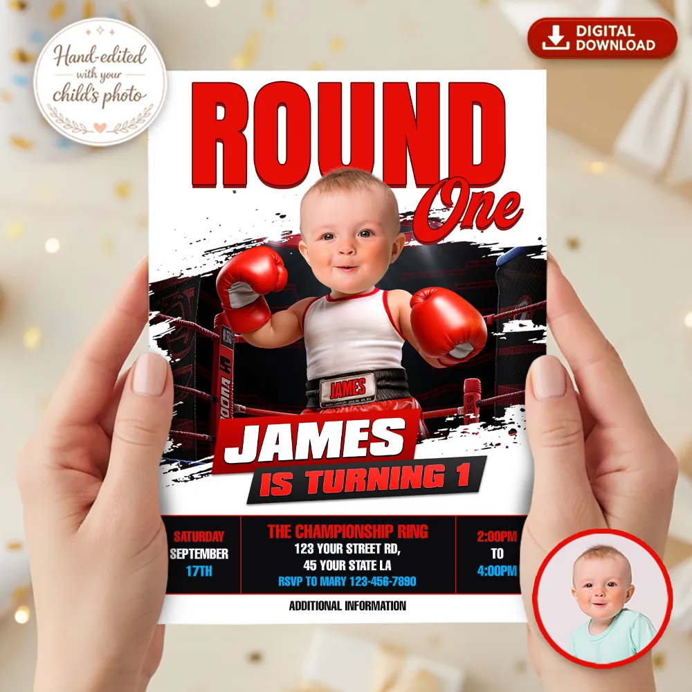 Perfect for parents who want a strong, fun, and unforgettable invitation, this personalized file transforms your baby into the champion of his own “Round One” celebration.