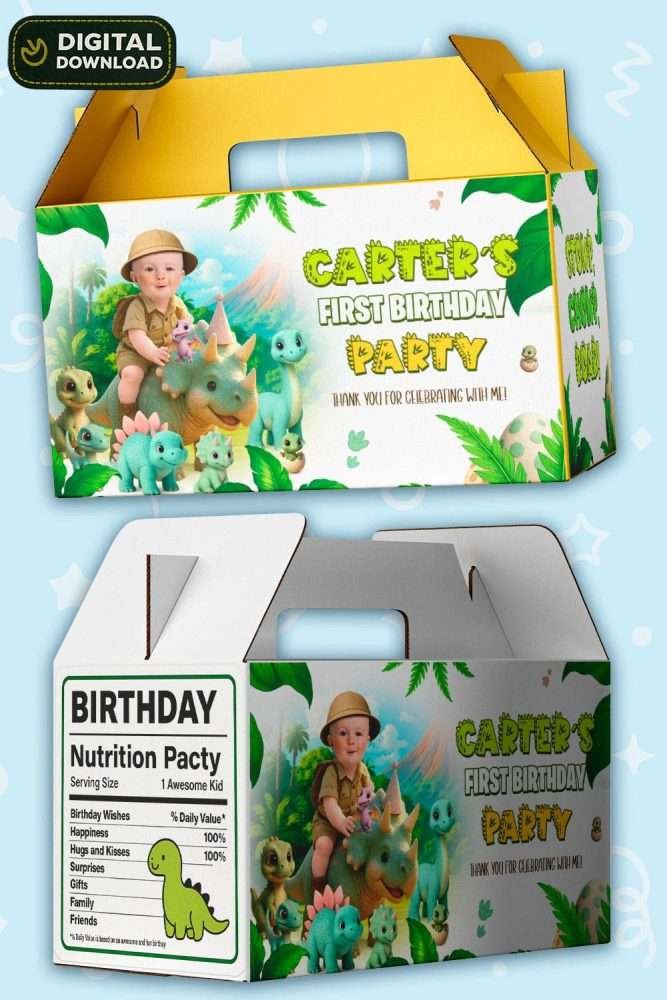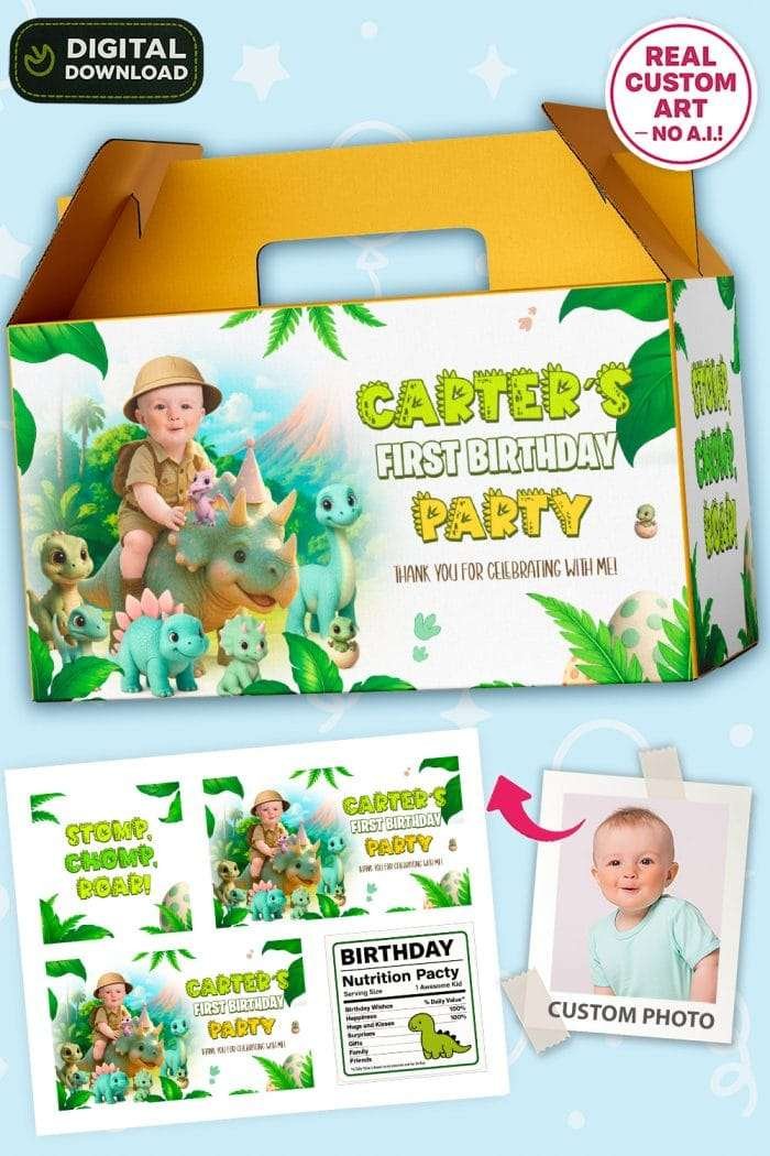 Our Baby Dinosaur personalized digital sticker designs are perfect for decorating gable boxes and creating themed favor packaging that looks fun, professional, and photo-ready.
