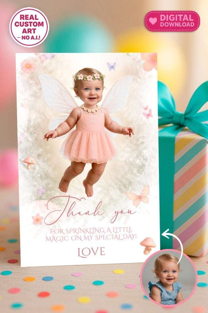 Personalized Baby Fairy Thank You Card with Photo – Custom Fairy First Theme Design – Delivered in 24h – Digital File