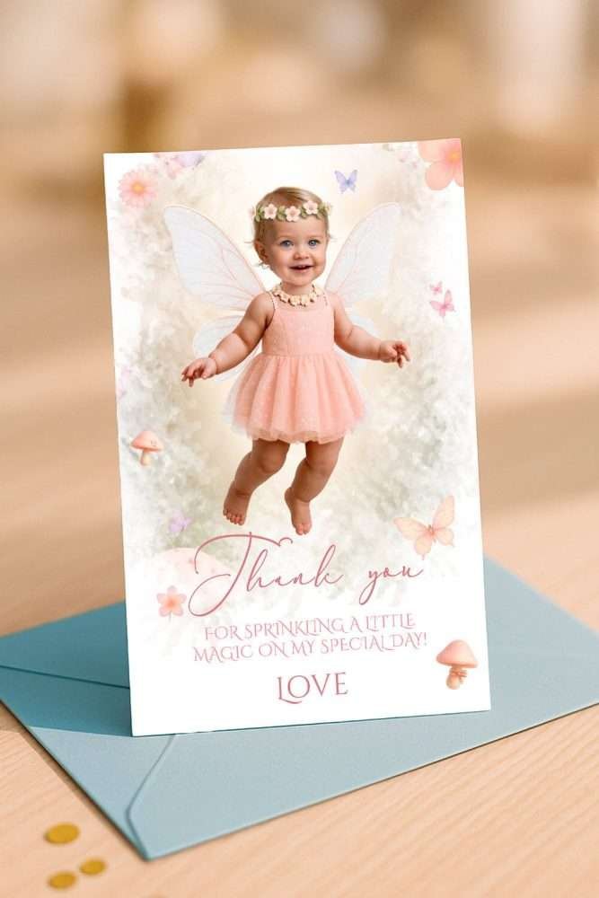 Whether you hosted a Fairy First 1st birthday or a whimsical toddler party, this thank-you card keeps the fairy-tale magic alive while sharing heartfelt thanks with your guests.