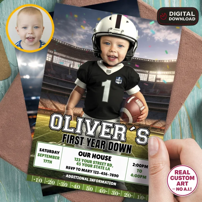 You’ll get a high-resolution JPEG file (300 DPI) personalized with your child’s photo, name, age, and party details in a playful “First Year Down” football theme. Standard size is 5×7 inches, ideal for printing or digital sharing.