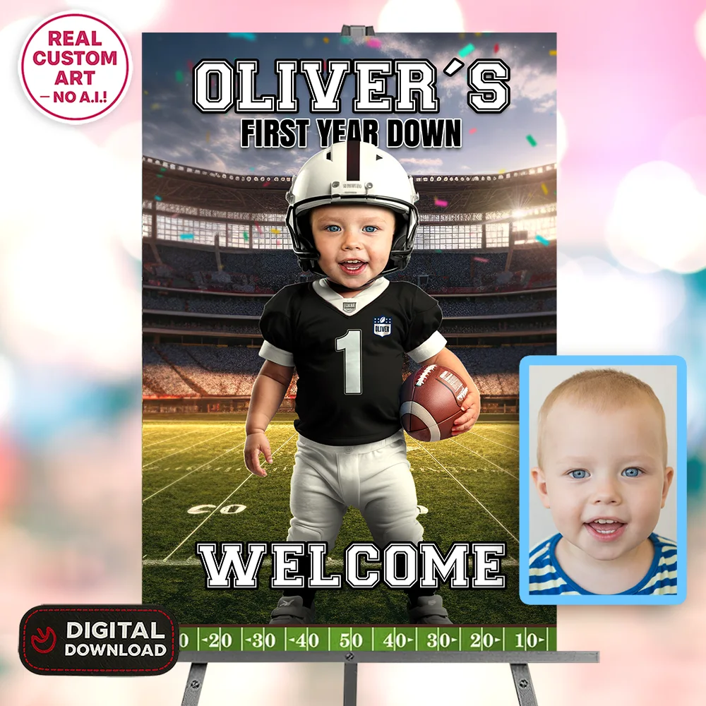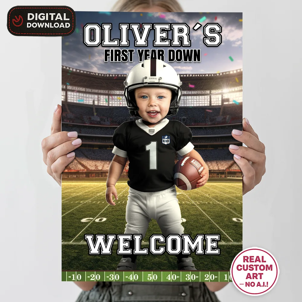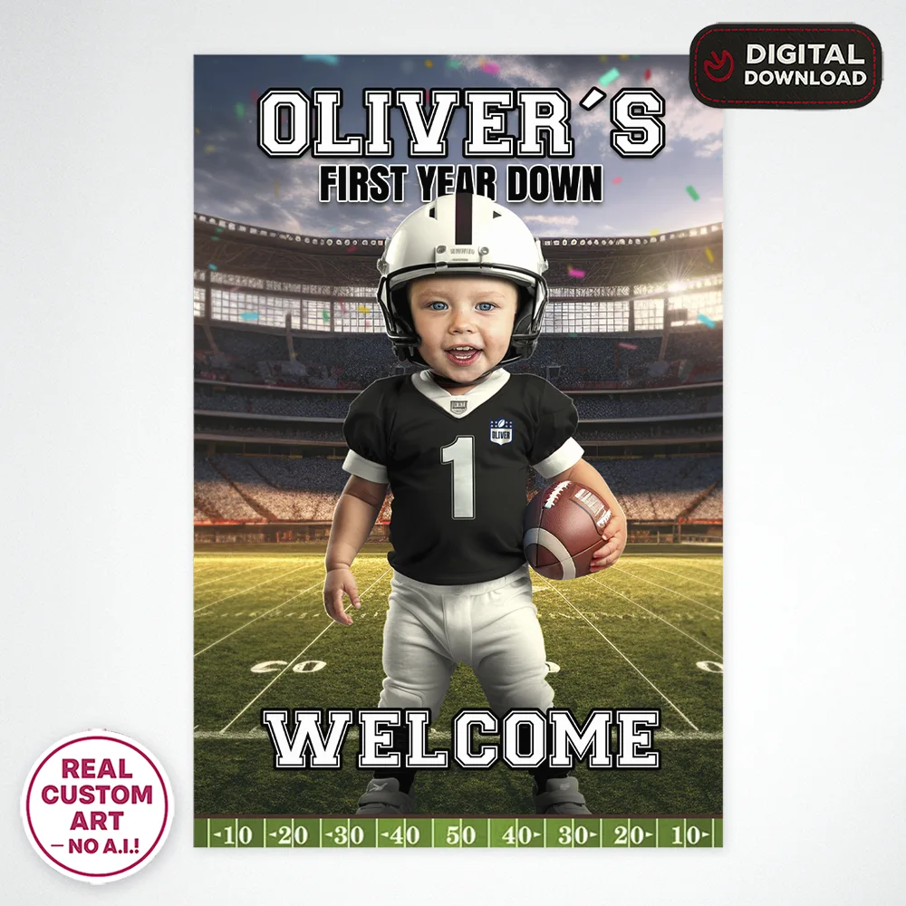 🏈 Personalized Baby Football Welcome Sign with Photo – First Year Down Theme – Custom Football Party Decor (24h Delivery) – Digital Download
