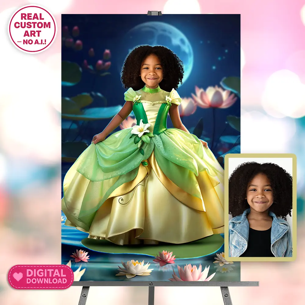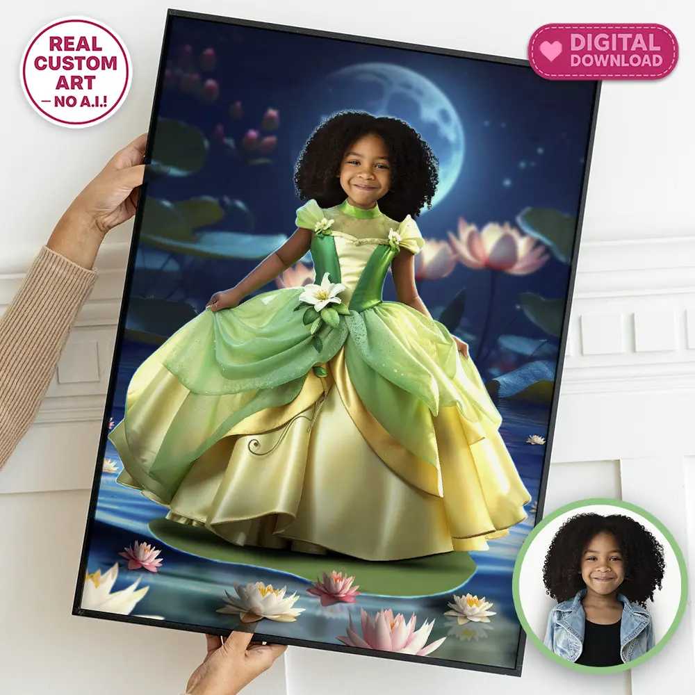 You’ll get a high-resolution JPEG file (300 DPI) personalized with your child’s photo transformed into a magical Bayou Princess portrait. This artwork is designed as a keepsake or decoration for enchanting princess-themed birthdays.