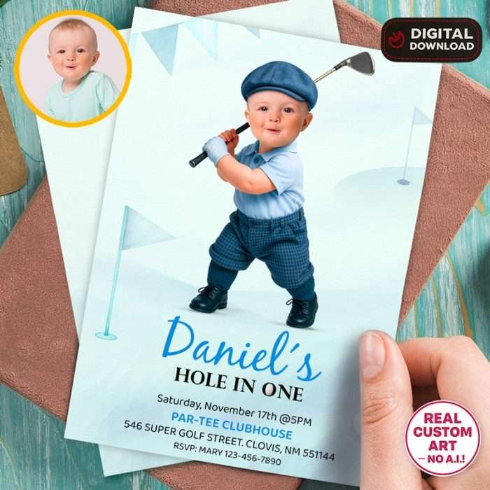 You’ll get a high-resolution JPEG file (300 DPI) personalized with your child’s photo, name, age, and party details in a playful Blue Golf “Hole in One” theme. Standard size is 5×7 inches, ideal for printing or digital sharing.