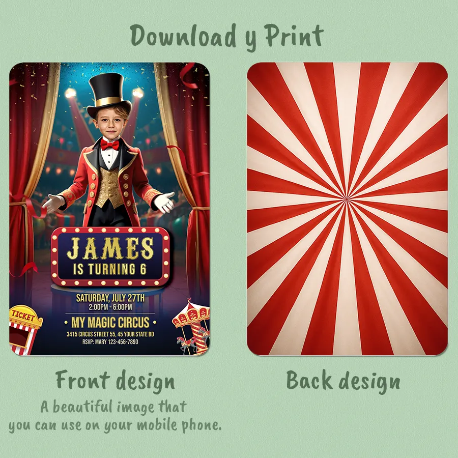 You’ll get a high-resolution JPEG file (300 DPI) personalized with your child’s photo, name, age, and party details in a vibrant Circus Ringmaster / Big Top theme. Standard size is 5×7 inches, ideal for printing or digital sharing.
