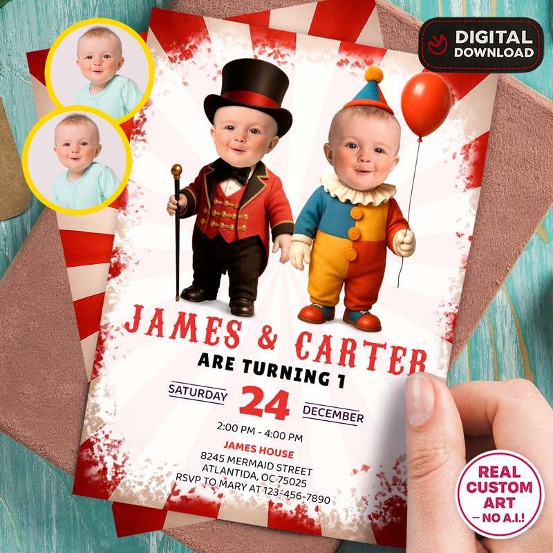 Personalized Circus Ringmaster Twins Birthday Invitation with Photo – Siblings Edition – Delivered in 24h – Digital File